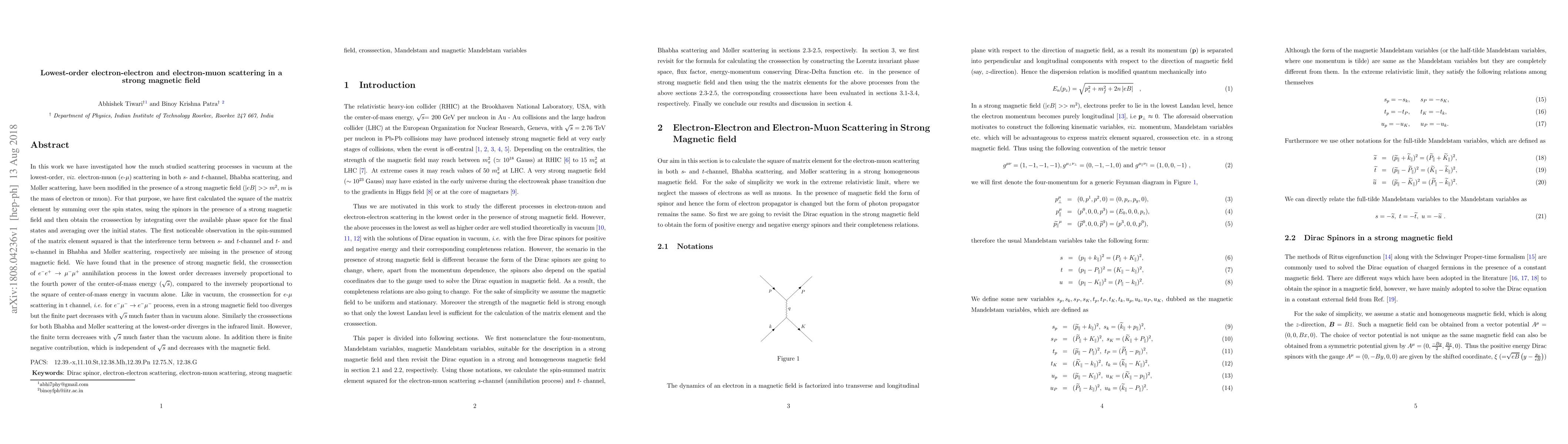 In this work we have investigated how the much studied scattering processes in vacuum at the lowest-order, {\em viz.} electron-muon ($e$-$\mu$) scattering in both $s$- and $t$-channel, Bhabha scattering, and M{\o}ller scattering, have been modified in the presence of a strong magnetic field ($|eB|>>m^2$, $m$ is the mass of electron or muon). For that purpose, we have first calculated the square of the matrix element by summing over the spin states, using the spinors in the presence of a strong magnetic field and then obtain the crosssection by integrating over the available phase space for the final states and averaging over the initial states. The first noticeable observation in the spin-summed of the matrix element squared is that the interference term between $s$- and $t$-channel and $t$- and $u$-channel in Bhabha and M{\o}ller scattering, respectively are missing in the presence of strong magnetic field. We have found that in the presence of strong magnetic field, the crosssection of $e^- e^+ \rightarrow \mu^- \mu^+$ annihilation process in the lowest order decreases inversely proportional to the fourth power of the center-of-mass energy ($\sqrt{s}$), compared to the inversely proportional to the square of center-of-mass energy in vacuum alone. Like in vacuum, the crosssection for $e$-$\mu$ scattering in ${\rm t}$ channel, {\em i.e.} for $e^- \mu^- \rightarrow e^- \mu^-$ process, even in a strong magnetic field too diverges but the finite part decreases with $\sqrt{s}$ much faster than in vacuum alone. Similarly the crosssections for both Bhabha and M{\o}ller scattering at the lowest-order diverges in the infrared limit. However, the finite term decreases with $\sqrt{s}$ much faster than the vacuum alone. In addition there is finite negative contribution, which is independent of $\sqrt{s}$ and decreases with the magnetic field.