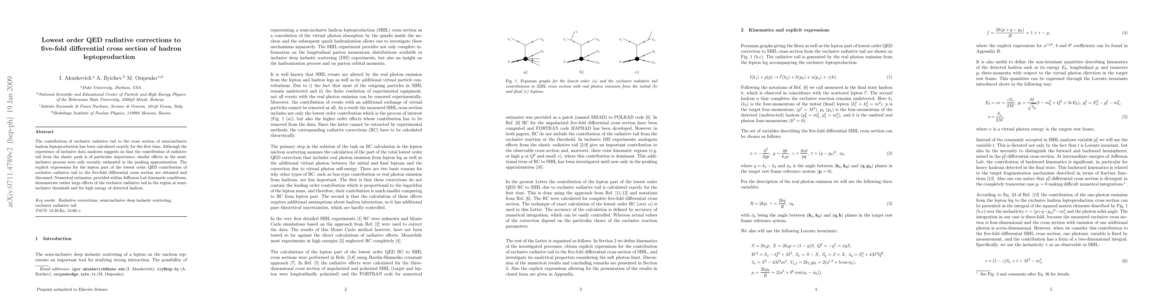 This paper presents the first exact calculation of the lowest order QED radiative corrections to the five-fold differential cross section for semi-inclusive hadron leptoproduction. The study reveals significant effects of the exclusive radiative tail, particularly near the semi-inclusive threshold and for high-energy detected hadrons, under Jefferson Lab kinematic conditions.