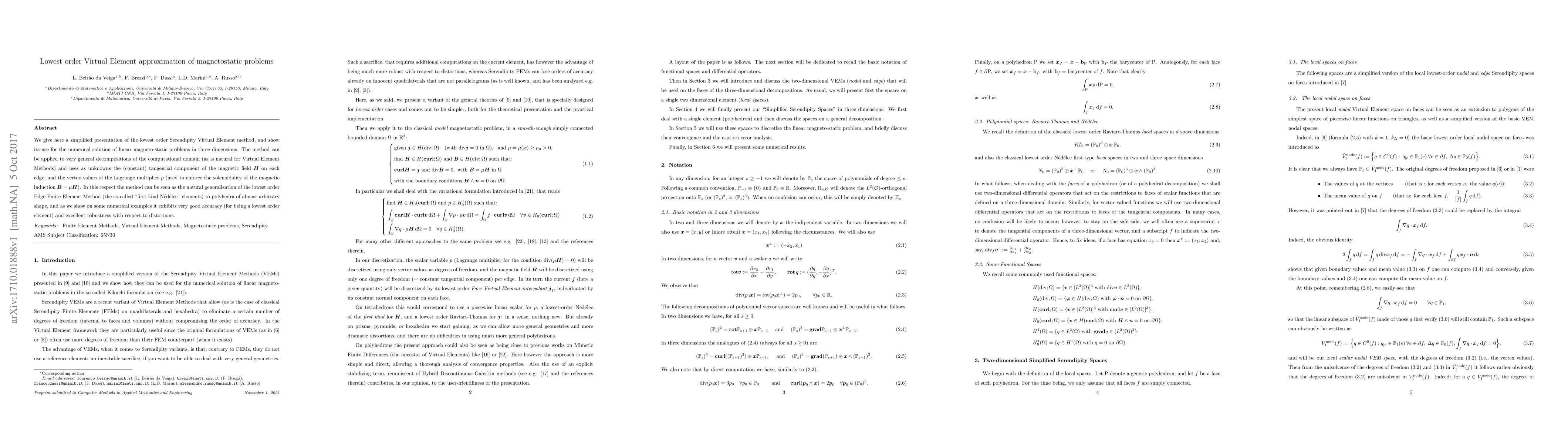 We give here a simplified presentation of the lowest order Serendipity Virtual Element method, and show its use for the numerical solution of linear magneto-static problems in three dimensions. The method can be applied to very general decompositions of the computational domain (as is natural for Virtual Element Methods) and uses as unknowns the (constant) tangential component of the magnetic field $\mathbf{H}$ on each edge, and the vertex values of the Lagrange multiplier $p$ (used to enforce the solenoidality of the magnetic induction $\mathbf{B}=\mu\mathbf{H}$). In this respect the method can be seen as the natural generalization of the lowest order Edge Finite Element Method (the so-called "first kind N\'ed\'elec" elements) to polyhedra of almost arbitrary shape, and as we show on some numerical examples it exhibits very good accuracy (for being a lowest order element) and excellent robustness with respect to distortions.