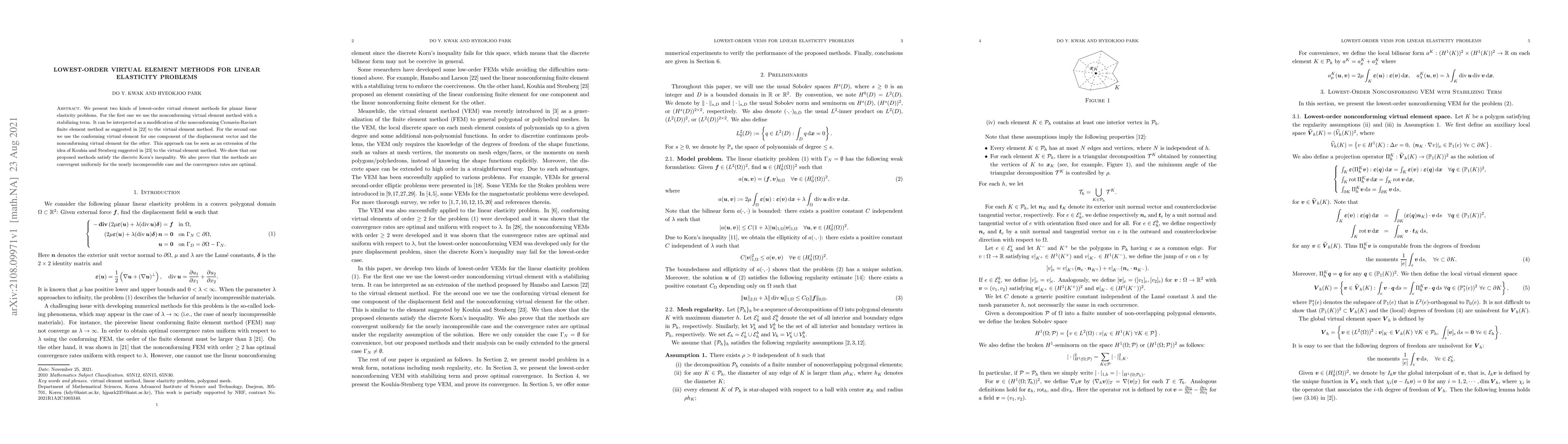 The paper proposes two lowest-order virtual element methods for planar linear elasticity problems, showing convergence and satisfying the discrete Korn's inequality, with optimal convergence rates for nearly incompressible cases. The methods include a nonconforming variant and a hybrid conforming-nonconforming approach.