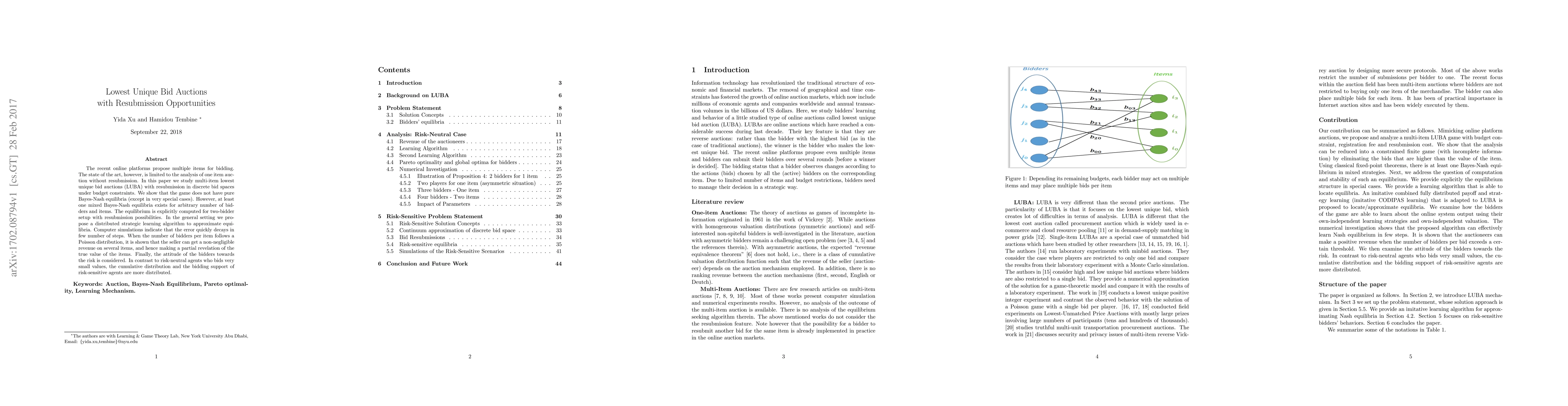 The recent online platforms propose multiple items for bidding. The state of the art, however, is limited to the analysis of one item auction without resubmission. In this paper we study multi-item lowest unique bid auctions (LUBA) with resubmission in discrete bid spaces under budget constraints. We show that the game does not have pure Bayes-Nash equilibria (except in very special cases). However, at least one mixed Bayes-Nash equilibria exists for arbitrary number of bidders and items. The equilibrium is explicitly computed for two-bidder setup with resubmission possibilities. In the general setting we propose a distributed strategic learning algorithm to approximate equilibria. Computer simulations indicate that the error quickly decays in few number of steps. When the number of bidders per item follows a Poisson distribution, it is shown that the seller can get a non-negligible revenue on several items, and hence making a partial revelation of the true value of the items. Finally, the attitude of the bidders towards the risk is considered. In contrast to risk-neutral agents who bids very small values, the cumulative distribution and the bidding support of risk-sensitive agents are more distributed.