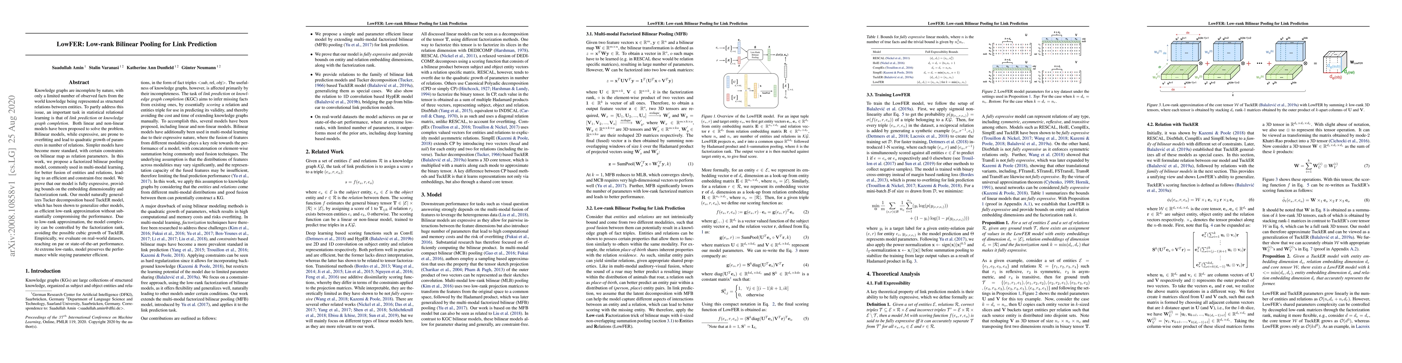 Knowledge graphs are incomplete by nature, with only a limited number of observed facts from the world knowledge being represented as structured relations between entities. To partly address this issue, an important task in statistical relational learning is that of link prediction or knowledge graph completion. Both linear and non-linear models have been proposed to solve the problem. Bilinear models, while expressive, are prone to overfitting and lead to quadratic growth of parameters in number of relations. Simpler models have become more standard, with certain constraints on bilinear map as relation parameters. In this work, we propose a factorized bilinear pooling model, commonly used in multi-modal learning, for better fusion of entities and relations, leading to an efficient and constraint-free model. We prove that our model is fully expressive, providing bounds on the embedding dimensionality and factorization rank. Our model naturally generalizes Tucker decomposition based TuckER model, which has been shown to generalize other models, as efficient low-rank approximation without substantially compromising the performance. Due to low-rank approximation, the model complexity can be controlled by the factorization rank, avoiding the possible cubic growth of TuckER. Empirically, we evaluate on real-world datasets, reaching on par or state-of-the-art performance. At extreme low-ranks, model preserves the performance while staying parameter efficient.
