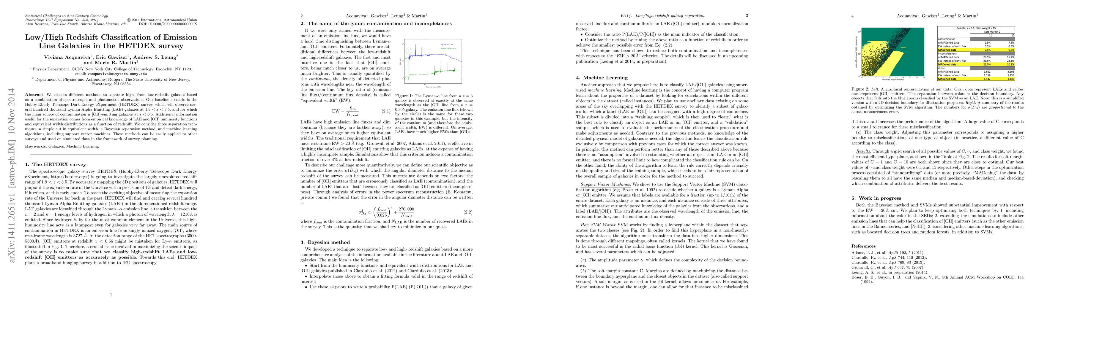 This paper explores methods to distinguish high-redshift Lyman Alpha Emitting (LAE) galaxies from low-redshift [OII]-emitting galaxies in the HETDEX survey using spectroscopic and photometric data. It evaluates three separation techniques: a simple equivalent width cut, a Bayesian method, and machine learning algorithms, demonstrating their applicability to other surveys and simulated data.