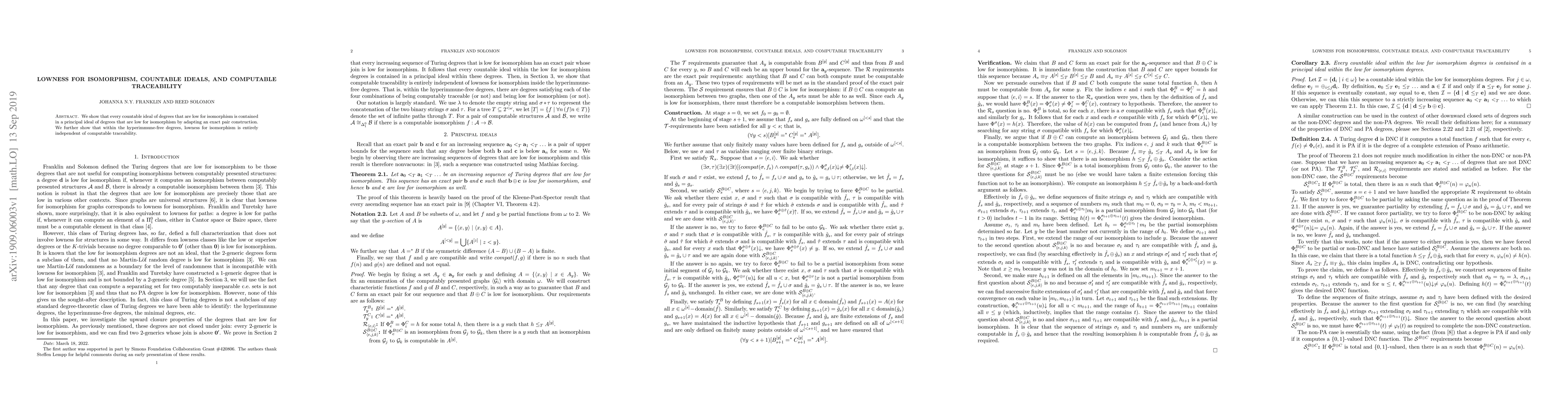 Summary: The paper demonstrates that every countable ideal of degrees low for isomorphism is contained within a principal ideal using an adapted exact pair construction. Additionally, it shows that lowness for isomorphism is independent of computable traceability within hyperimmune-free degrees.