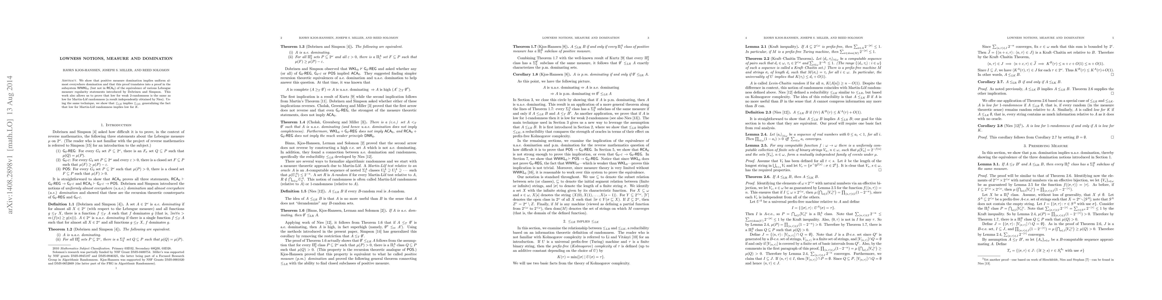 We show that positive measure domination implies uniform almost everywhere domination and that this proof translates into a proof in the subsystem WWKL$_0$ (but not in RCA$_0$) of the equivalence of various Lebesgue measure regularity statements introduced by Dobrinen and Simpson. This work also allows us to prove that low for weak $2$-randomness is the same as low for Martin-L\"of randomness (a result independently obtained by Nies). Using the same technique, we show that $\leq_{LR}$ implies $\leq_{LK}$, generalizing the fact that low for Martin-L\"of randomness implies low for $K$.