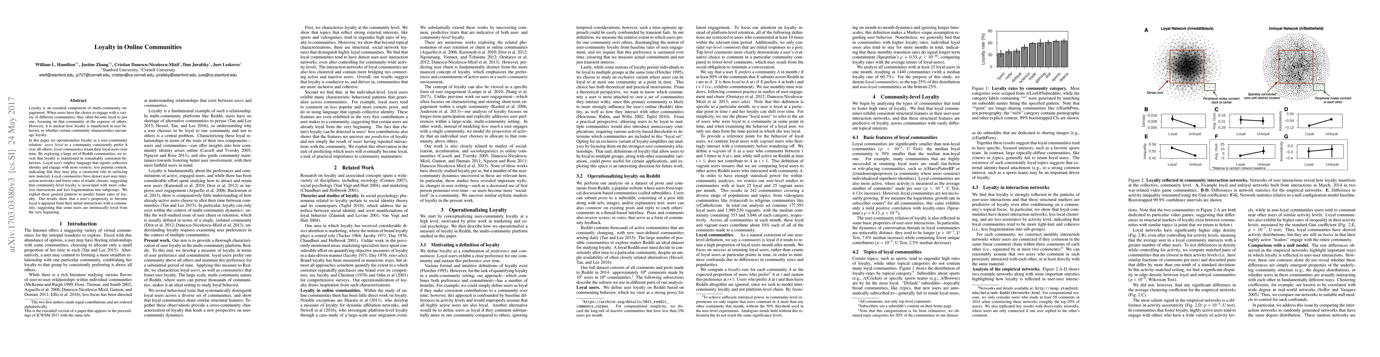 This paper examines loyalty in online communities, defining it as a consistent preference for one community over others and retention over time. Using Reddit's discussion communities, it finds that loyal users signal collective identity and engage with niche content, while loyal communities exhibit denser interactions and less subgroup fragmentation, predicting future loyalty based on initial user engagement.