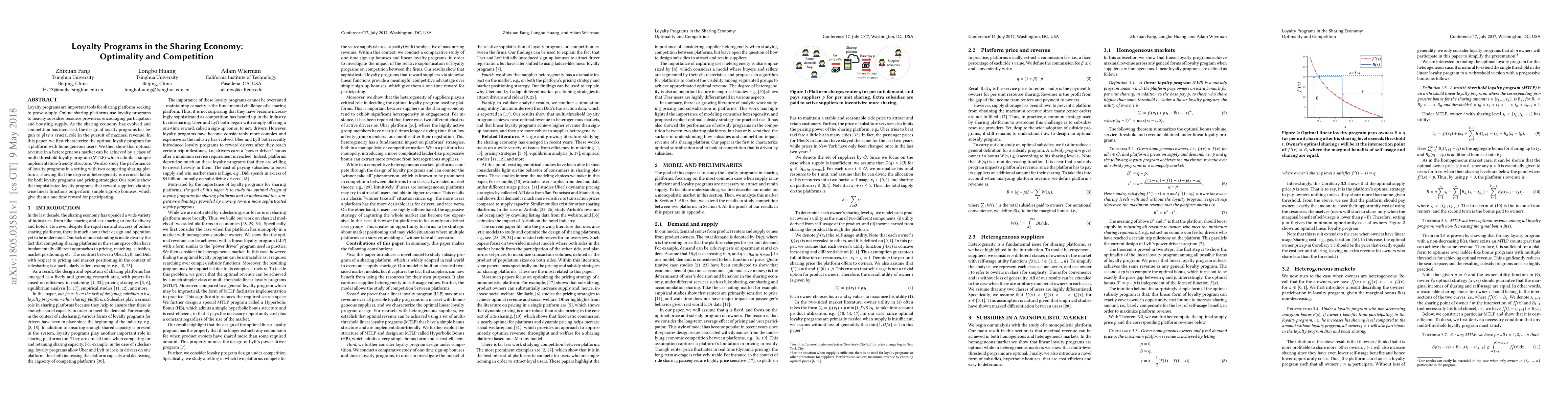 This paper investigates the design of optimal loyalty programs for sharing platforms to maximize revenue, demonstrating that multi-threshold loyalty programs (MTLP) are effective for heterogeneous markets. It also examines competition between two platforms, highlighting the importance of supplier heterogeneity in shaping both loyalty and pricing strategies.
