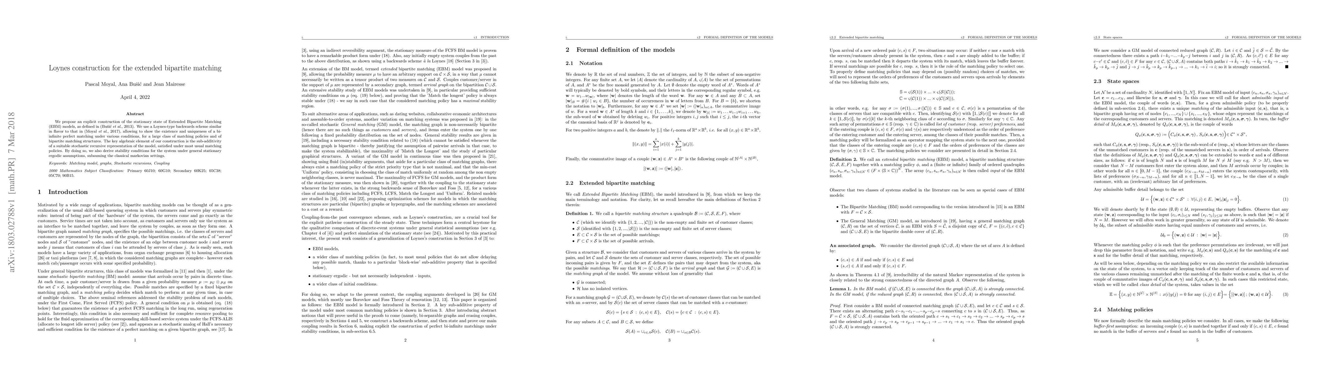 This paper presents a Loynes-type backwards scheme to construct the stationary state of Extended Bipartite Matching models, proving the existence and uniqueness of bi-infinite perfect matchings under various conditions. The key lies in the sub-additivity of a stochastic recursive representation, leading to stability conditions under general stationary ergodic assumptions.