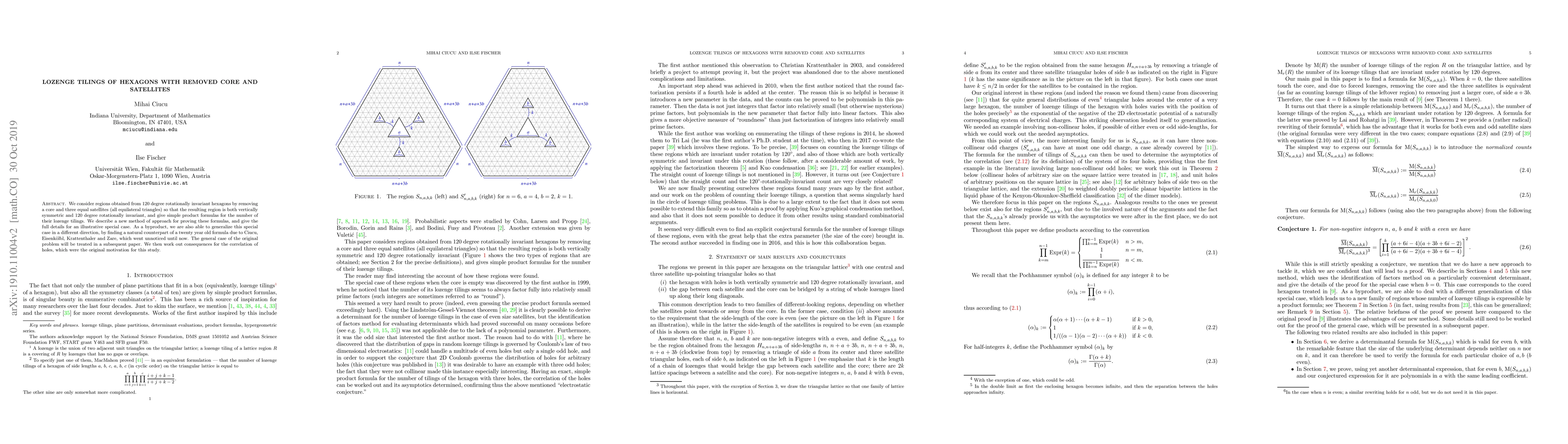 This paper presents product formulas for lozenge tilings of hexagonal regions with a removed core and three equilateral triangle satellites, employing a novel approach. It also generalizes a previous formula and explores the correlation of holes as a consequence.