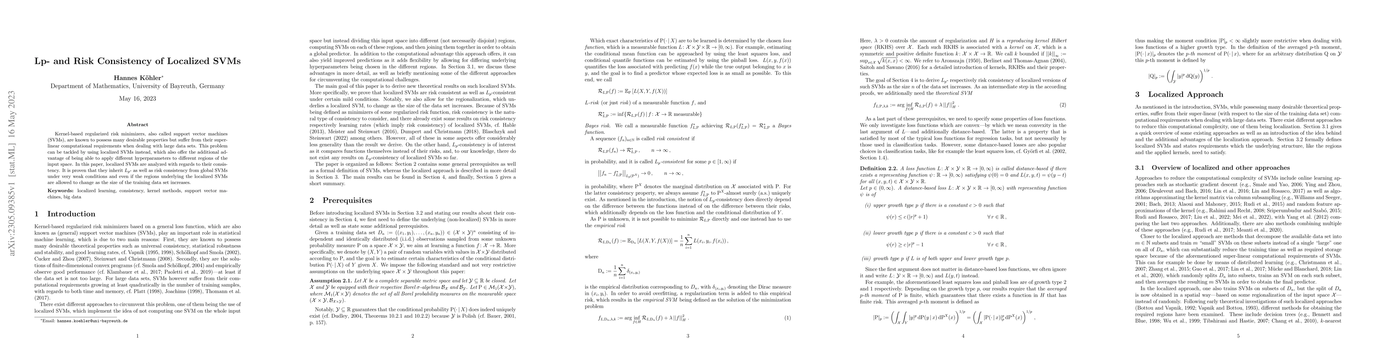 This paper investigates localized support vector machines (SVMs) and demonstrates their $L_p$- and risk consistency, showing that they maintain the same properties as global SVMs under minimal conditions, even when the regions they operate on change with larger training datasets.