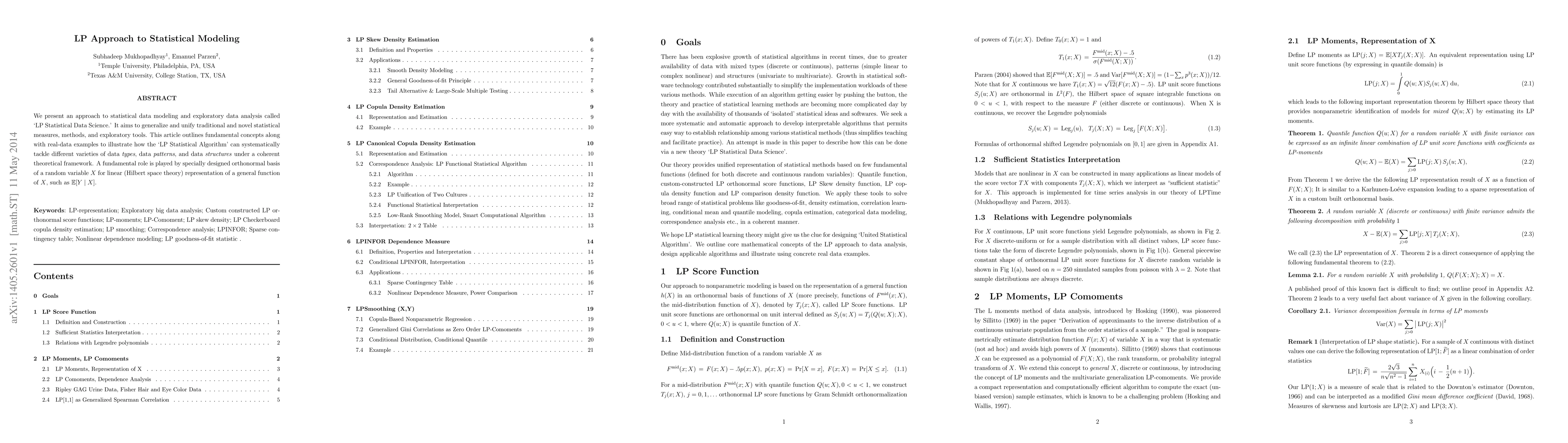 We present an approach to statistical data modeling and exploratory data analysis called `LP Statistical Data Science.' It aims to generalize and unify traditional and novel statistical measures, methods, and exploratory tools. This article outlines fundamental concepts along with real-data examples to illustrate how the `LP Statistical Algorithm' can systematically tackle different varieties of data types, data patterns, and data structures under a coherent theoretical framework. A fundamental role is played by specially designed orthonormal basis of a random variable X for linear (Hilbert space theory) representation of a general function of X, such as $\mbox{E}[Y \mid X]$.