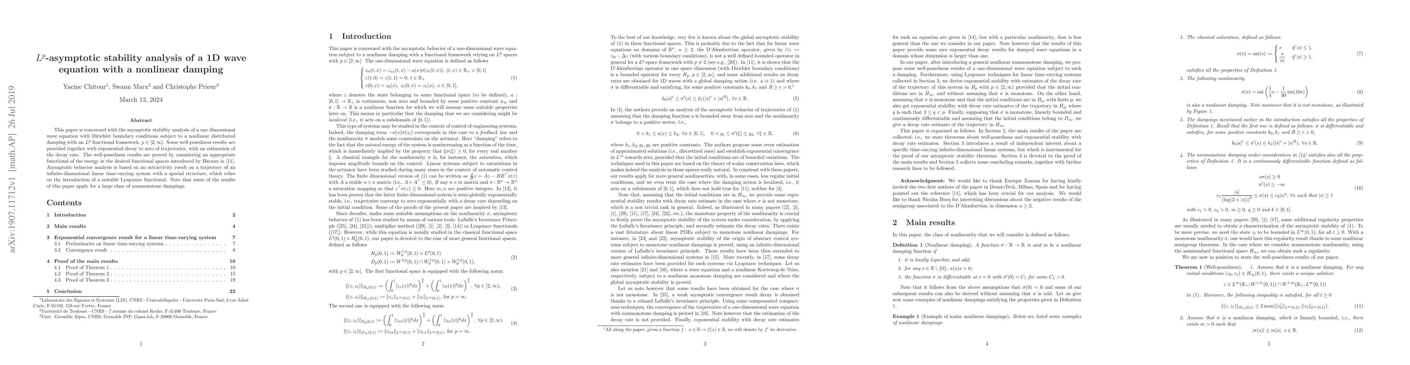 This paper analyzes the L^p-asymptotic stability of a 1D wave equation with nonlinear damping, proving well-posedness and exponential decay of trajectories using an L^p functional framework. The analysis employs a Lyapunov functional for an infinite-dimensional linear time-varying system to establish the stability results.
