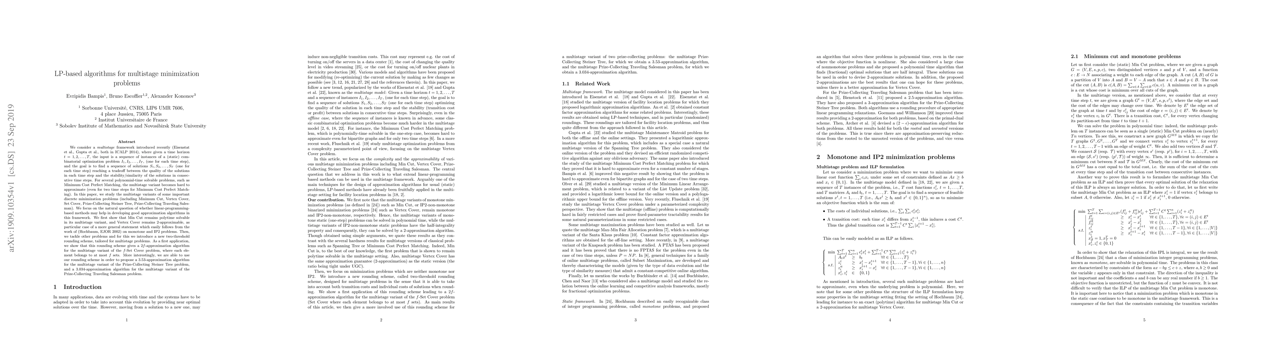 The paper introduces LP-based algorithms for multistage minimization problems, focusing on problems like Minimum Cut, Vertex Cover, Set Cover, Prize-Collecting Steiner Tree, and Prize-Collecting Traveling Salesman. It proposes a new 2-threshold rounding scheme to handle problems that are neither monotone nor IP2 problems.