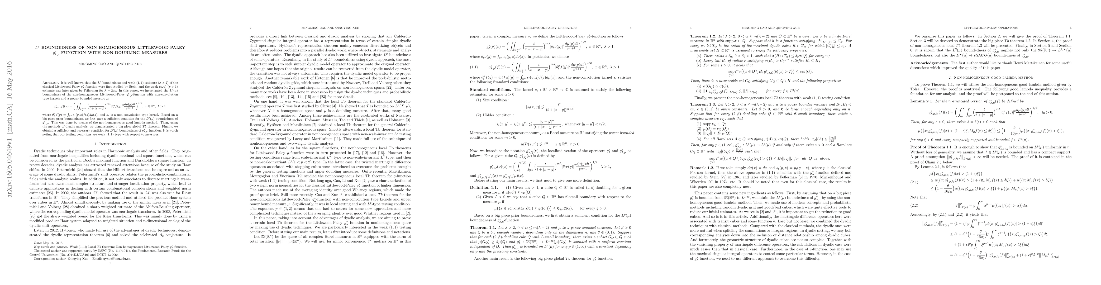 This paper investigates the $L^p(\mu)$ boundedness of the non-homogeneous Littlewood-Paley $g_{\lambda,\mu}^*$-function with non-convolution type kernels and a power bounded measure $\mu$. The authors establish sufficient and necessary conditions for this boundedness using the non-homogeneous good lambda method and dyadic analysis.