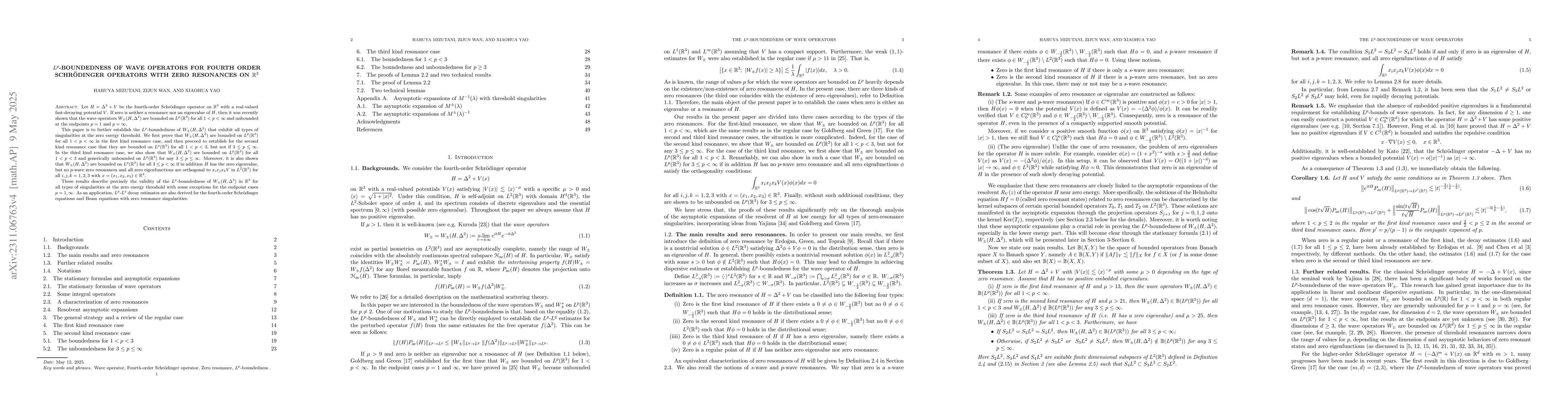This paper establishes $L^p$-boundedness of wave operators for fourth-order Schrödinger operators on $\mathbb{R}^3$, showing different bounds for various resonance cases and conditions, and deriving $L^p$-$L^q$ decay estimates for related solutions.