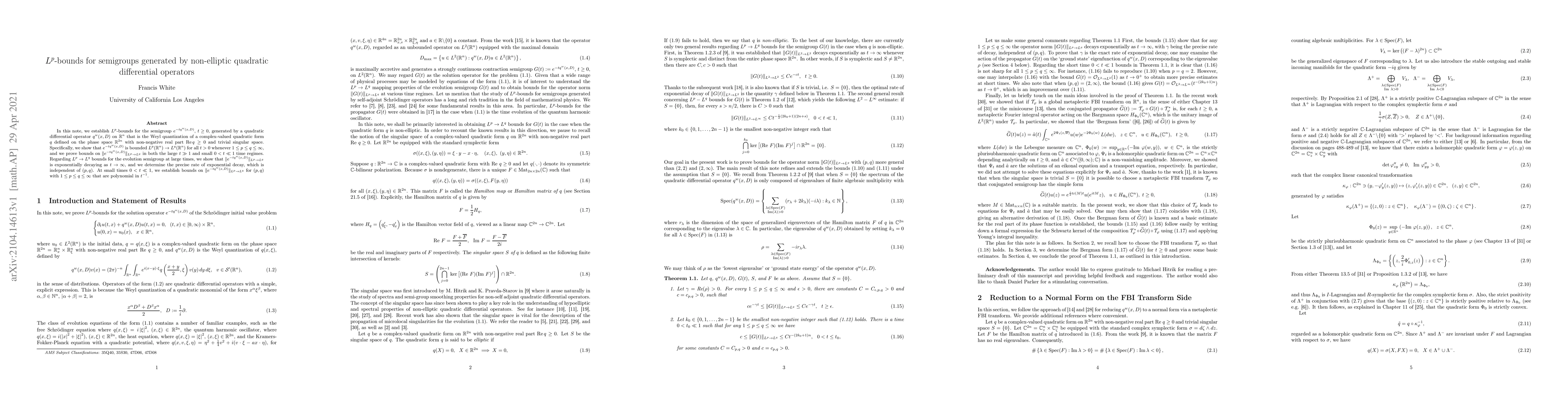 In this note, we establish $L^p$-bounds for the semigroup $e^{-tq^w(x,D)}$, $t \ge 0$, generated by a quadratic differential operator $q^w(x,D)$ on $\mathbb{R}^n$ that is the Weyl quantization of a complex-valued quadratic form $q$ defined on the phase space $\mathbb{R}^{2n}$ with non-negative real part $\textrm{Re} \, q \ge 0$ and trivial singular space. Specifically, we show that $e^{-tq^w(x,D)}$ is bounded $L^p(\mathbb{R}^n) \rightarrow L^q(\mathbb{R}^n)$ for all $t > 0$ whenever $1 \le p \le q \le \infty$, and we prove bounds on $||e^{-tq^w(x,D)}||_{L^p \rightarrow L^q}$ in both the large $t \gg 1$ and small $0 < t \ll 1$ time regimes. Regarding $L^p \rightarrow L^q$ bounds for the evolution semigroup at large times, we show that $||e^{-tq^w(x,D)}||_{L^p \rightarrow L^q}$ is exponentially decaying as $t \rightarrow \infty$, and we determine the precise rate of exponential decay, which is independent of $(p,q)$. At small times $0 < t \ll 1$, we establish bounds on $||e^{-tq^w(x,D)}||_{L^p \rightarrow L^q}$ for $(p,q)$ with $1 \le p \le q \le \infty$ that are polynomial in $t^{-1}$.