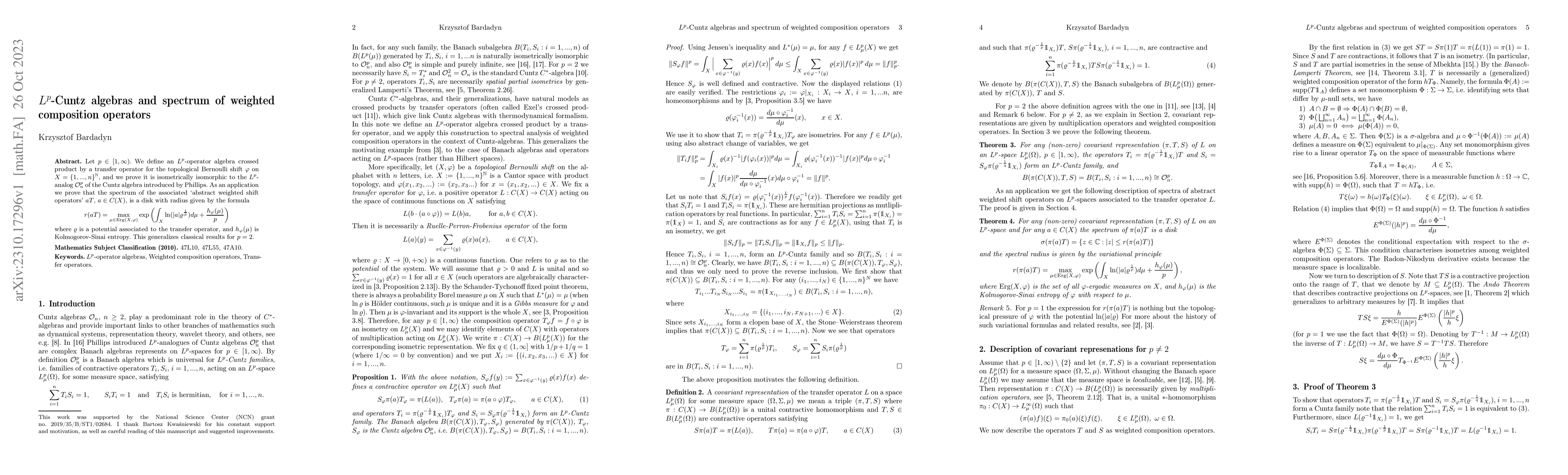 Let $p\in [1,\infty)$. We define an $L^p$-operator algebra crossed product by a transfer operator for the topological Bernoulli shift $\varphi$ on $X=\{1,...,n\}^{\mathbb{N}}$, and we prove it is isometrically isomorphic to the $L^p$-analog $\mathcal{O}_n^p$ of the Cuntz algebra introduced by Phillips. As an application, we prove that the spectrum of the associated `abstract weighted shift operators' $aT$, $a\in C(X)$, is a disk with a radius given by the formula $$ r(aT)=\max_{\mu\in\text{Erg}(X,\varphi)} \exp\left( \int_X \ln(|a|\varrho^{\frac{1}{p}})d\mu + \frac{h_\varphi(\mu)}{p} \right) $$ where $\varrho$ is a potential associated to the transfer operator, and $h_\varphi(\mu)$ is Kolmogorov-Sinai entropy. This generalizes classical results for $p=2$.