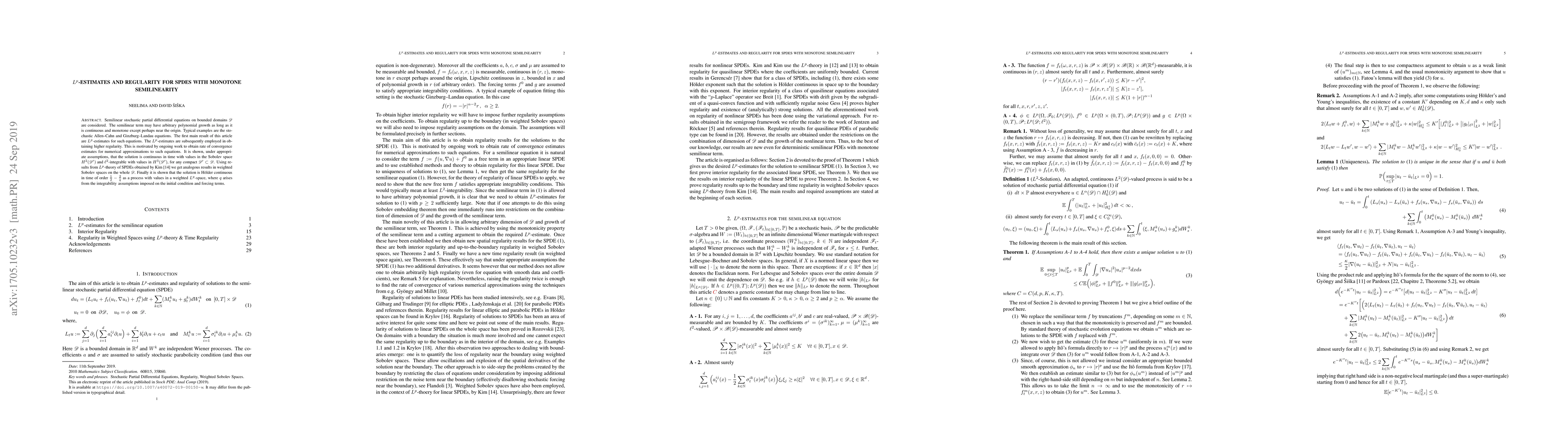 Semilinear stochastic partial differential equations on bounded domains $\mathscr{D}$ are considered. The semilinear term may have arbitrary polynomial growth as long as it is continuous and monotone except perhaps near the origin. Typical examples are the stochastic Allen--Cahn and Ginzburg--Landau equations. The first main result of this article are $L^p$-estimates for such equations. The $L^p$-estimates are subsequently employed in obtaining higher regularity. This is motivated by ongoing work to obtain rate of convergence estimates for numerical approximations to such equations. It is shown, under appropriate assumptions, that the solution is continuous in time with values in the Sobolev space $H^2(\mathscr{D}')$ and $\ell^2$-integrable with values in $H^3(\mathscr{D}')$, for any compact $\mathscr{D}' \subset \mathscr{D}$. Using results from $L^p$-theory of SPDEs obtained by Kim~\cite{kim04} we get analogous results in weighted Sobolev spaces on the whole $\mathscr{D}$. Finally it is shown that the solution is H\"older continuous in time of order $\frac{1}{2} - \frac{2}{q}$ as a process with values in a weighted $L^q$-space, where $q$ arises from the integrability assumptions imposed on the initial condition and forcing terms.