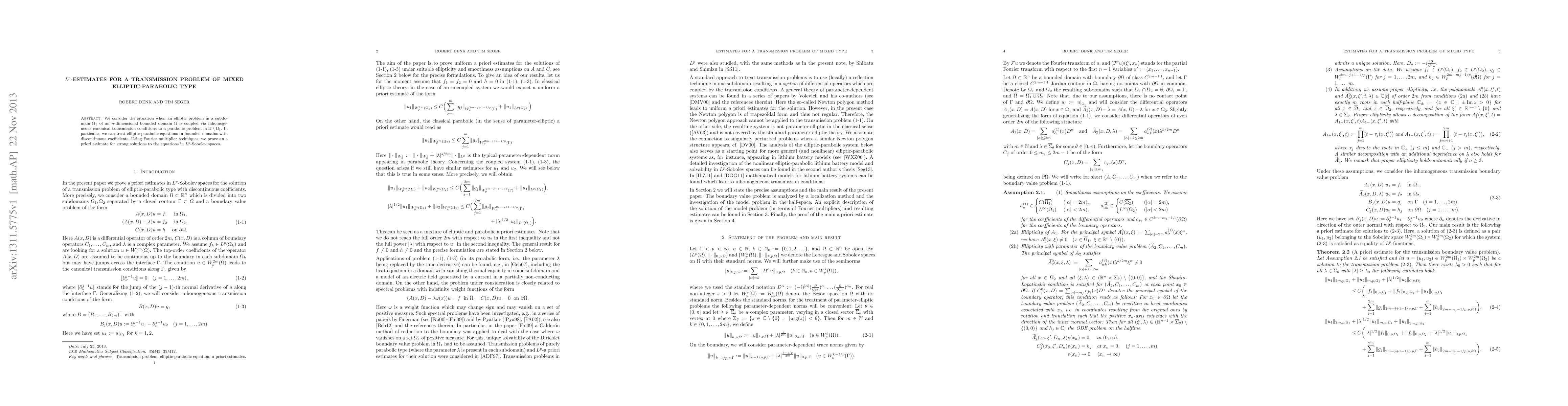 We consider the situation when an elliptic problem in a subdomain $\Omega_1$ of an $n$-dimensional bounded domain $\Omega$ is coupled via inhomogeneous canonical transmission conditions to a parabolic problem in $\Omega\setminus\Omega_1$. In particular, we can treat elliptic-parabolic equations in bounded domains with discontinuous coefficients. Using Fourier multiplier techniques, we prove an a priori estimate for strong solutions to the equations in $L^p$-Sobolev spaces.