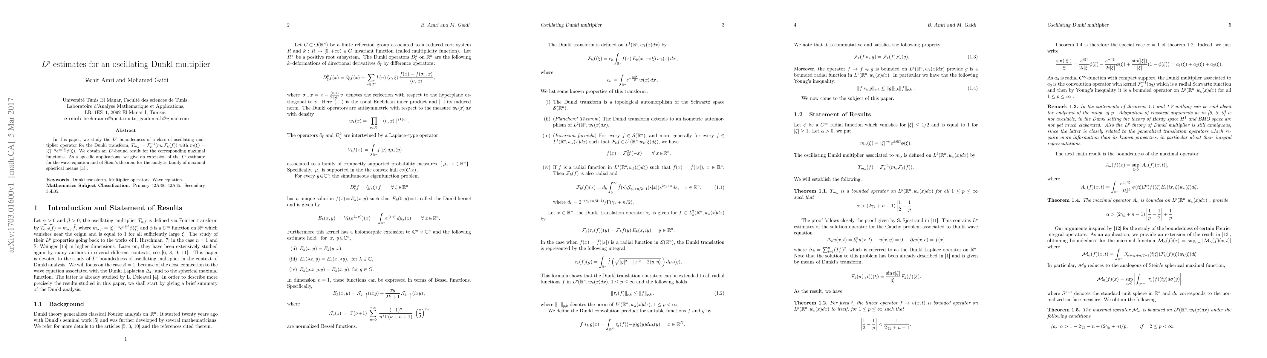 In this paper, we study the $L^p$ boundedness of a class of oscillating multiplier operator for the Dunkl transform, $T_{m_\alpha}=\mathcal{F}_k^{-1}(m_{\alpha}\mathcal{F}_k(f))$ with $m(\xi)=|\xi|^{-\alpha}e^{\pm i|\xi|}\phi(\xi)$. We obtain an $L^p$-bound result for the corresponding maximal functions. As a specific applications, we give an extension of the $L^p$ estimate for the wave equation and of Stein's theorem for the analytic family of maximal spherical means \cite{Stein}