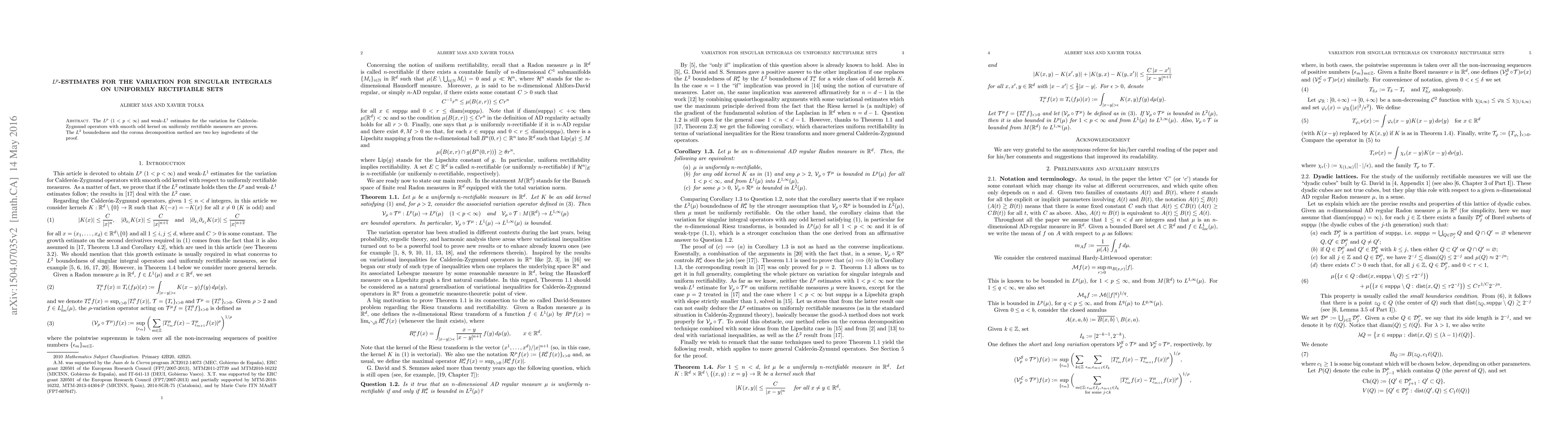 Summary: This paper proves $L^p$ and weak-$L^1$ estimates for the variation of Calderón-Zygmund operators on uniformly rectifiable sets, utilizing $L^2$ boundedness and the corona decomposition method as key proof techniques.