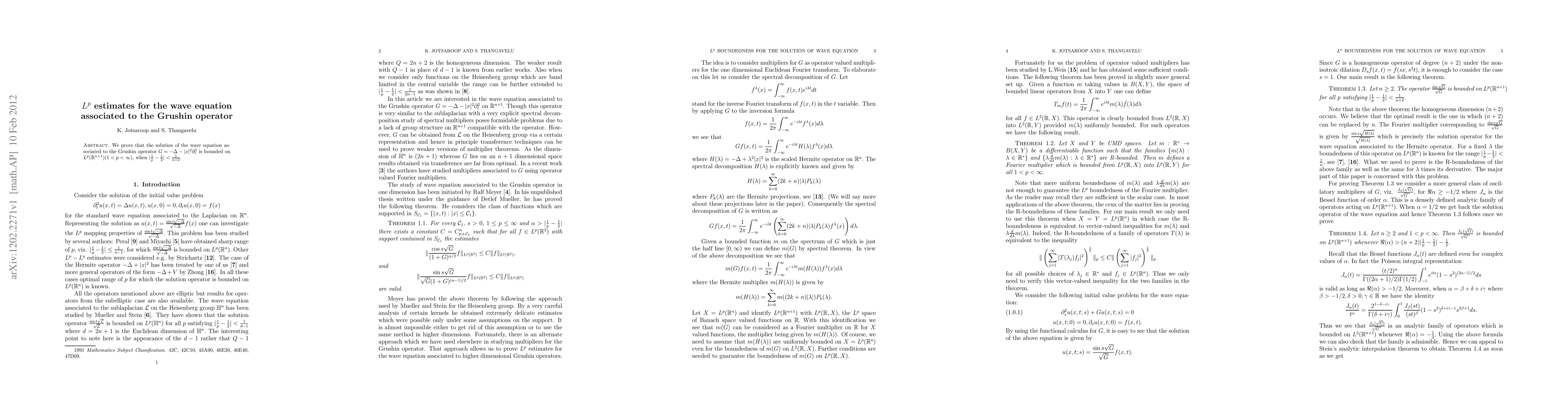 We prove that the solution of the wave equation as- sociated to the Grushin operator $ G = -\Delta +|x|^2 \partial_t^2 $ is bounded on $ L^p(R^{n+1})(1 < p < \infty)$, when $|1/p- 1/2 | < 1/n+2$ .