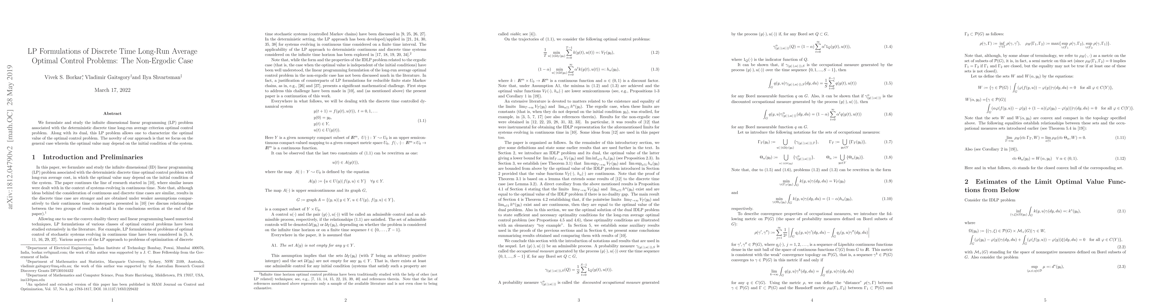This paper formulates an infinite-dimensional linear programming problem for deterministic discrete time long-run average optimal control, emphasizing non-ergodic scenarios where the optimal value varies with initial conditions. The study also explores the dual problem to characterize the optimal control value.