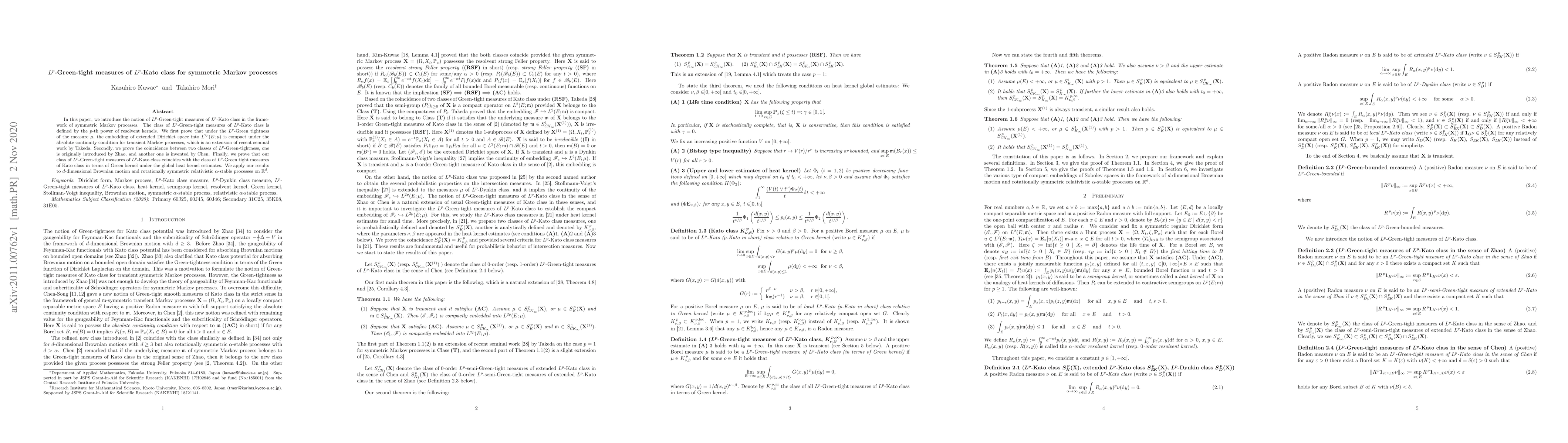 This paper introduces $L^p$-Green-tight measures of $L^p$-Kato class for symmetric Markov processes, proving their compactness and equivalence with other $L^p$-Green-tightness classes. The results are applied to $d$-dimensional Brownian motion and relativistic $\alpha$-stable processes.