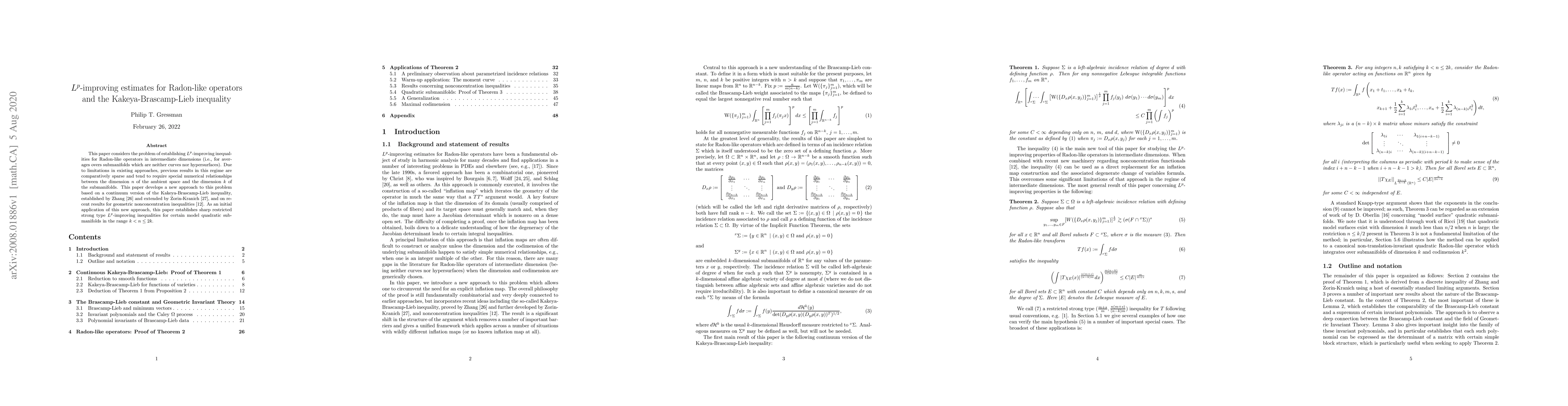 This paper considers the problem of establishing $L^p$-improving inequalities for Radon-like operators in intermediate dimensions (i.e., for averages overs submanifolds which are neither curves nor hypersurfaces). Due to limitations in existing approaches, previous results in this regime are comparatively sparse and tend to require special numerical relationships between the dimension $n$ of the ambient space and the dimension $k$ of the submanifolds. This paper develops a new approach to this problem based on a continuum version of the Kakeya-Brascamp-Lieb inequality, established by Zhang and extended by Zorin-Kranich, and on recent results for geometric nonconcentration inequalities. As an initial application of this new approach, this paper establishes sharp restricted strong type $L^p$-improving inequalities for certain model quadratic submanifolds in the range $k < n \leq 2k$.