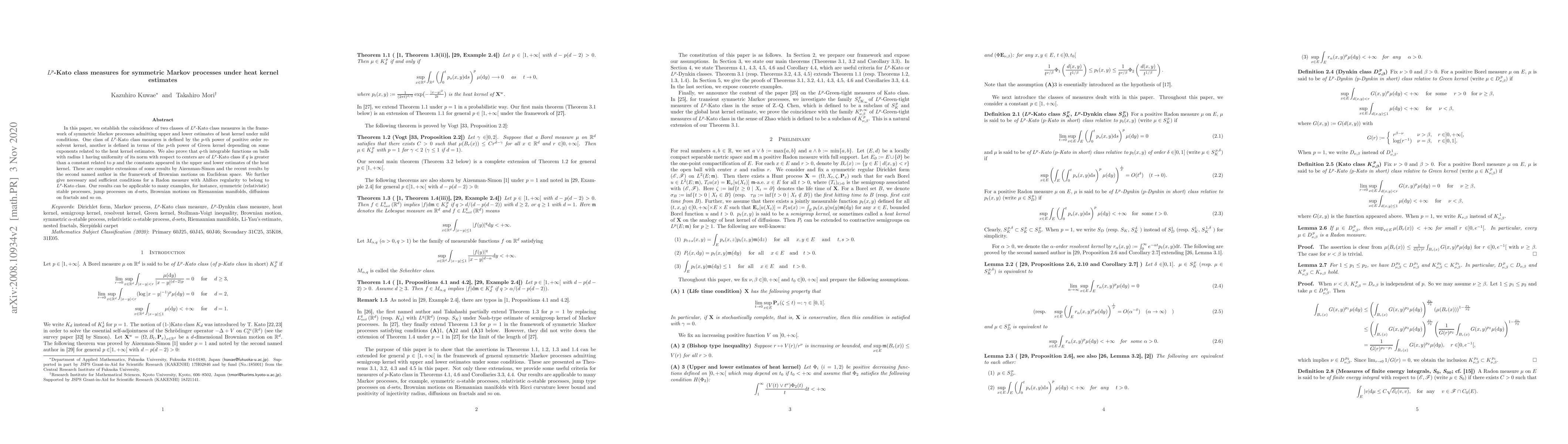 This paper establishes the equivalence of two $L^p$-Kato class measures in symmetric Markov processes, defined via the $p$-th power of resolvent and Green kernels. It also provides conditions for $q$-integrable functions to belong to $L^p$-Kato class and necessary/sufficient conditions for Radon measures with Ahlfors regularity to do so, extending prior results to various stochastic processes.