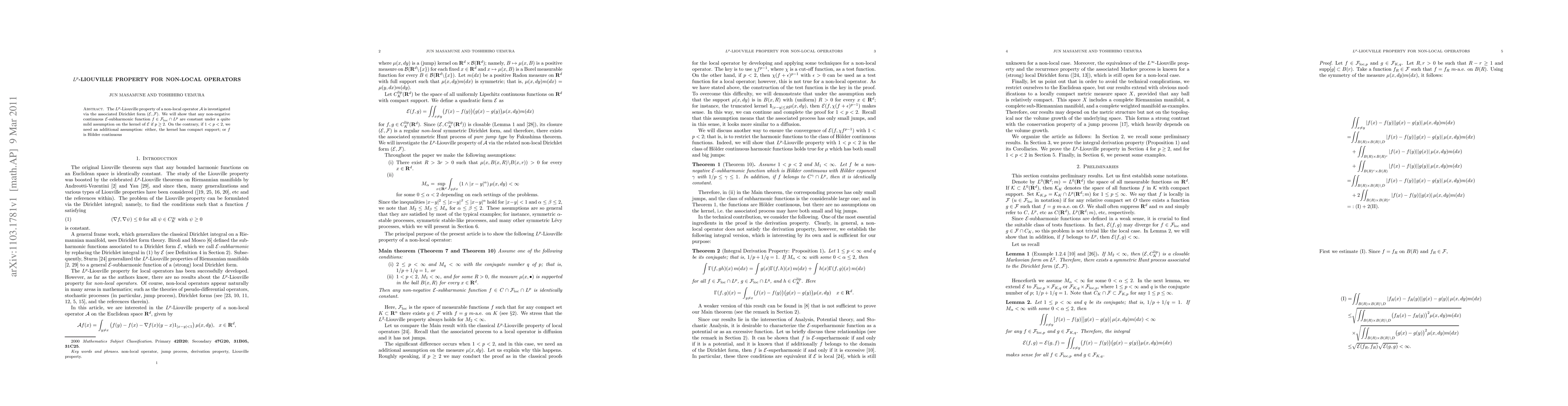 The Lp-Liouville property of a non-local operator A is investigated via the associated Dirichlet form. We will show that any non-negative continuous Lp E-subharmonic functions are constant under a quite mild assumption on the kernel of E if p is not less than 2. On the contrary, if 1 < p < 2, we need an additional assumption: either, the kernel has compact support; or f is Holder continuous.