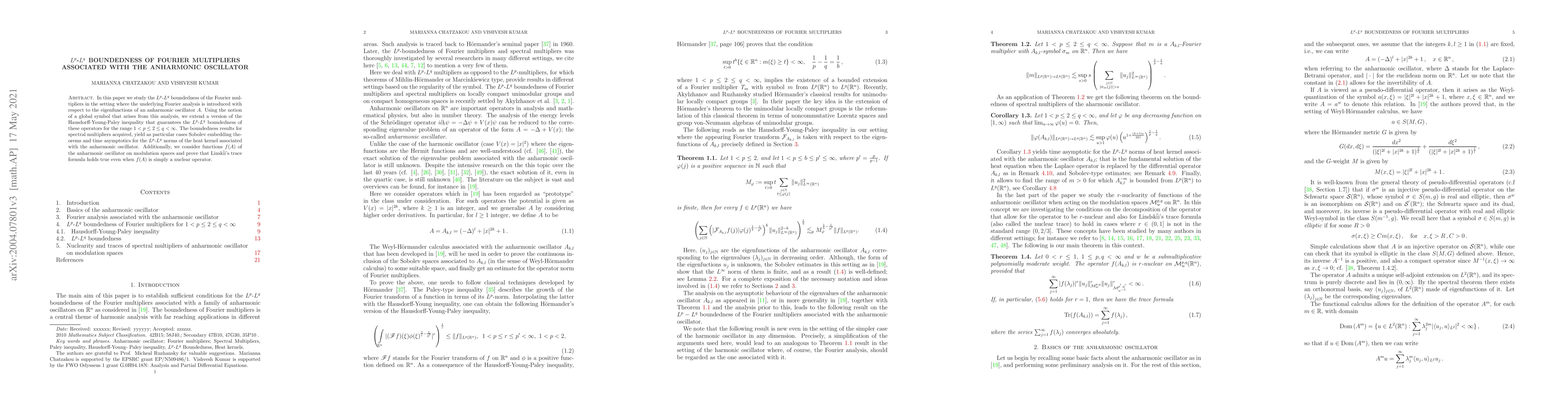 This paper investigates the $L^p$-$L^q$ boundedness of Fourier multipliers linked to the eigenfunctions of an anharmonic oscillator $A$, extending the Hausdorff-Young-Paley inequality and yielding Sobolev embeddings and heat kernel asymptotics. It also proves Linschi's trace formula for nuclear operators acting on modulation spaces.