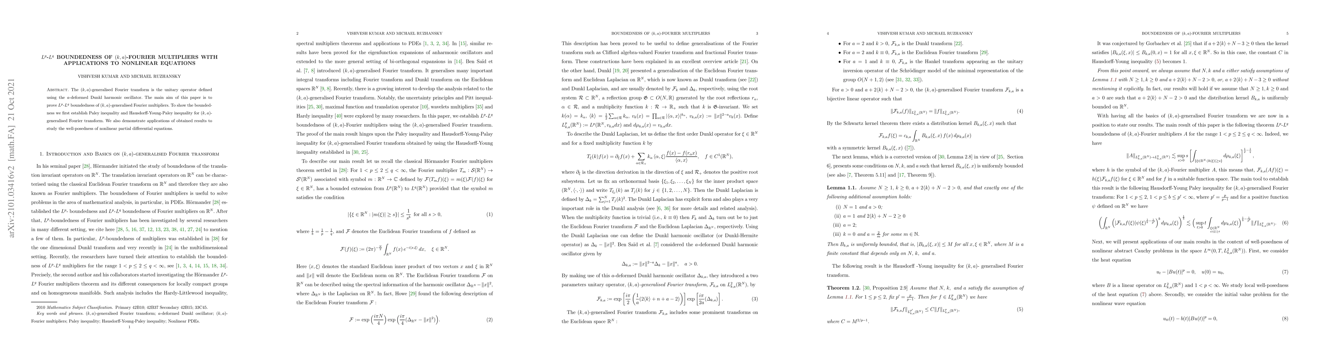 This paper proves $L^p$-$L^q$ boundedness for $(k, a)$-Fourier multipliers using the $(k, a)$-generalised Fourier transform linked to the $a$-deformed Dunkl harmonic oscillator. The proof leverages established Paley and Hausdorff-Young-Paley inequalities, and the results are applied to investigate the well-posedness of nonlinear partial differential equations.