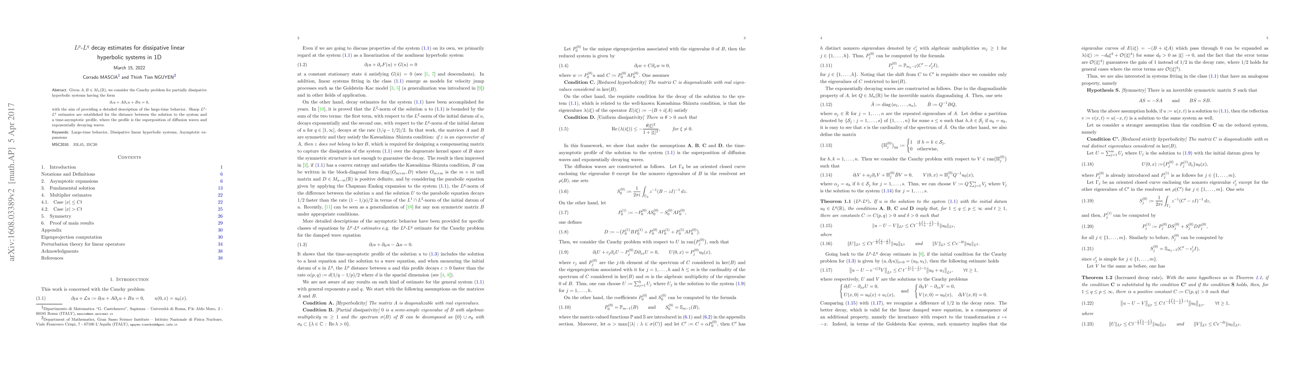 This research derives sharp L^p-L^q decay estimates for dissipative linear hyperbolic systems in one dimension. It describes the long-term behavior of solutions, showing they converge to a superposition of diffusion and exponentially decaying waves.