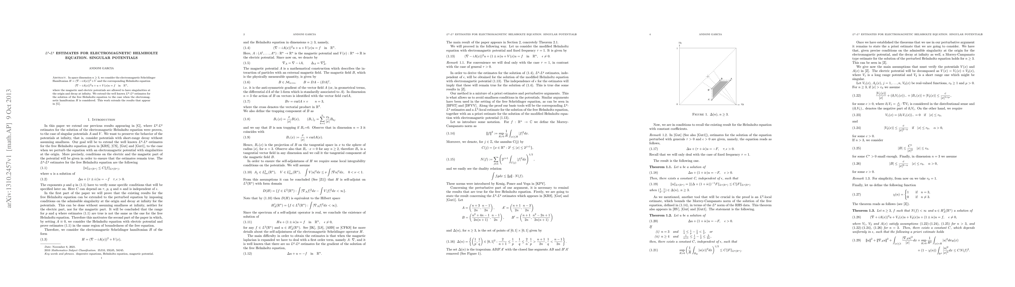 This paper extends $L^p$-$L^q$ estimates for the electromagnetic Helmholtz equation in dimensions $n\geq3$, considering singular potentials at the origin. It builds on previous results for the free Helmholtz equation, incorporating magnetic and electric potentials with singularities.