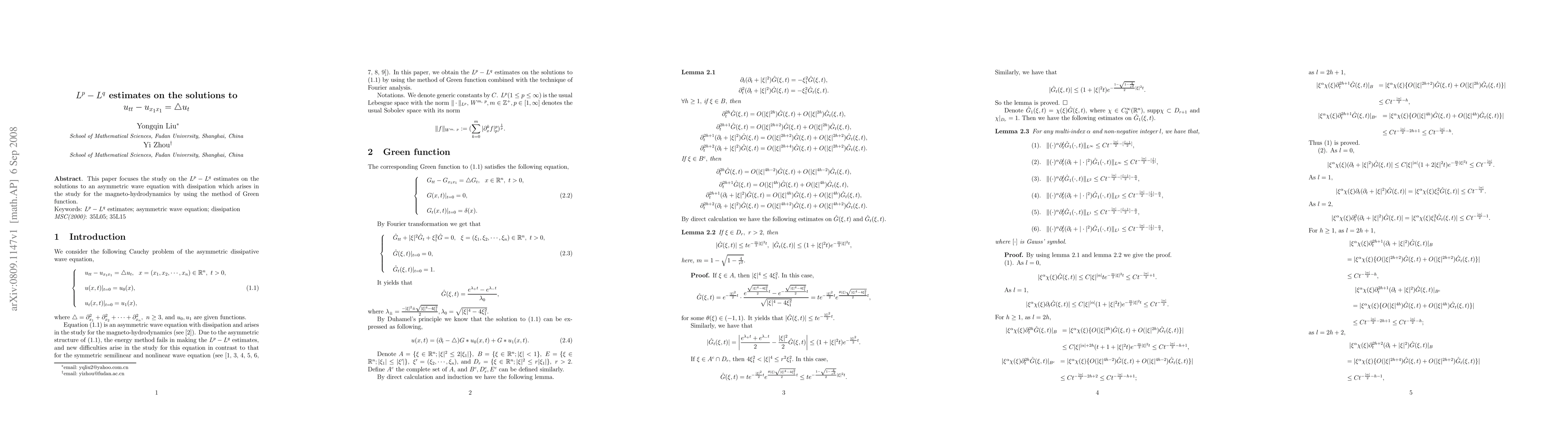 This paper investigates $L^p-L^q$ estimates for solutions to an asymmetric wave equation with dissipation, relevant to magneto-hydrodynamics, utilizing the method of Green functions. The results provide insights into the regularity and decay properties of the solutions.
