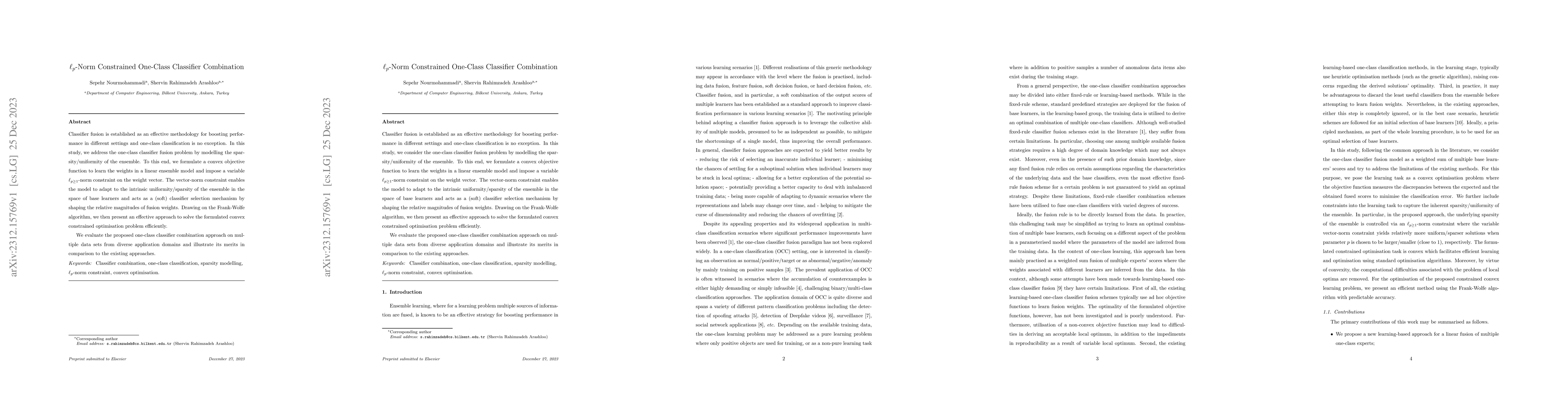 This paper proposes a convex optimization method for combining one-class classifiers by imposing an Lp-norm constraint on the ensemble weights to model ensemble sparsity/uniformity. The Frank-Wolfe algorithm is used to efficiently solve the optimization problem, and the approach is shown to outperform existing methods across various datasets.