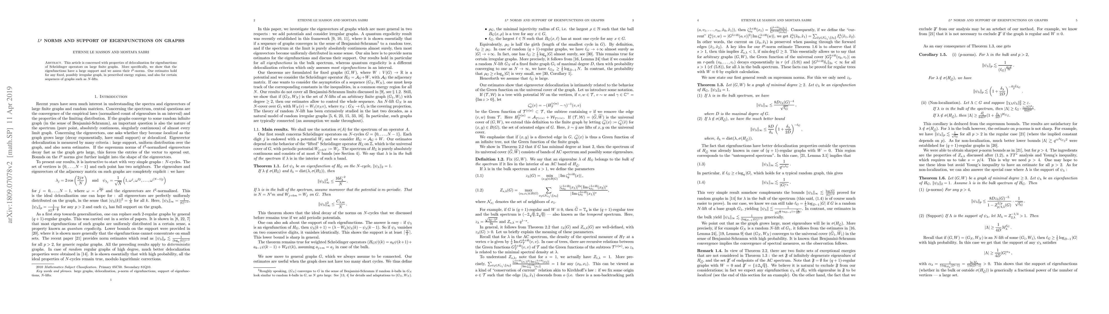 This paper investigates the delocalization properties of eigenfunctions for Schrödinger operators on large finite graphs, demonstrating that these eigenfunctions have extensive support and providing estimates for their $L^p$ norms across various energy regions and graph types, including N-lifts.
