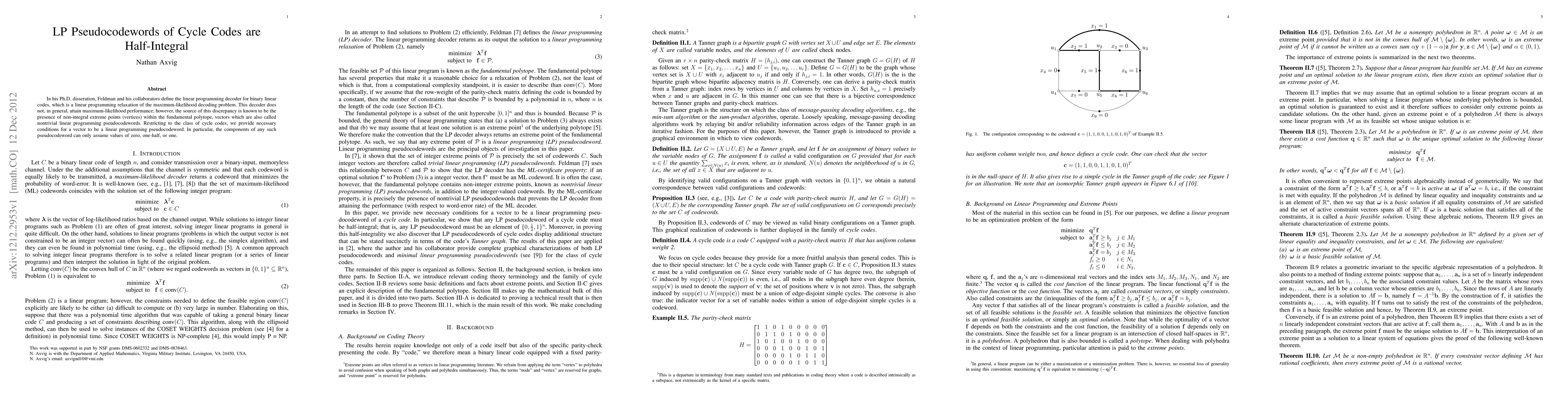 In his Ph.D. disseration, Feldman and his collaborators define the linear programming decoder for binary linear codes, which is a linear programming relaxation of the maximum-likelihood decoding problem. This decoder does not, in general, attain maximum-likelihood performance; however, the source of this discrepancy is known to be the presence of non-integral extreme points (vertices) within the fundamental polytope, vectors which are also called nontrivial linear programming pseudocodewords. Restricting to the class of cycle codes, we provide necessary conditions for a vector to be a linear programming pseudocodeword. In particular, the components of any such pseudocodeword can only assume values of zero, one-half, or one.