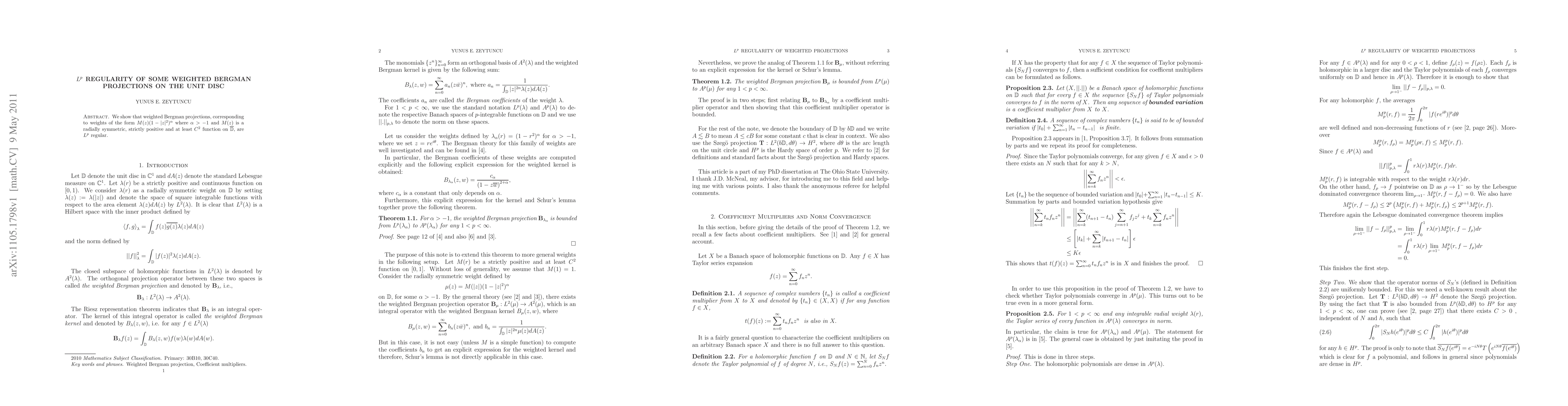 This paper demonstrates that weighted Bergman projections, defined by weights of the form $M(z)(1-|z|^2)^{\alpha}$ with $M(z)$ being a radially smooth and positive function, exhibit $L^p$ regularity for $\alpha > -1$. The results establish the boundedness of these projections in $L^p$ spaces.