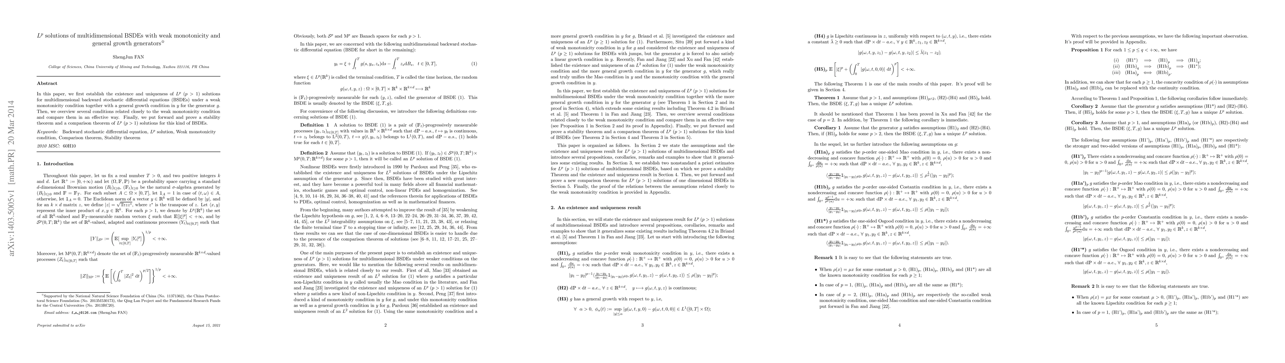 In this paper, we first establish the existence and uniqueness of $L^p\ (p>1)$ solutions for multidimensional backward stochastic differential equations (BSDEs) under a weak monotonicity condition together with a general growth condition in $y$ for the generator $g$. Then, we overview several conditions related closely to the weak monotonicity condition and compare them in an effective way. Finally, we put forward and prove a stability theorem and a comparison theorem of $L^p\ (p>1)$ solutions for this kind of BSDEs.