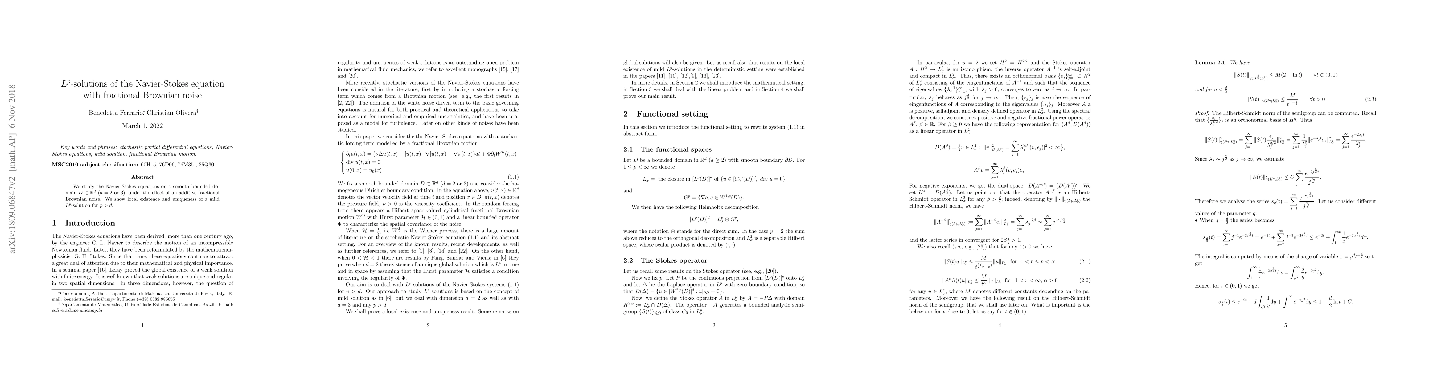 Summary: This paper investigates the Navier-Stokes equations with fractional Brownian noise, proving local existence and uniqueness of an $L^p$-solution under the condition $p>d$ for $d=2$ or $3$. The study focuses on smooth bounded domains in $\mathbb{R}^d$.