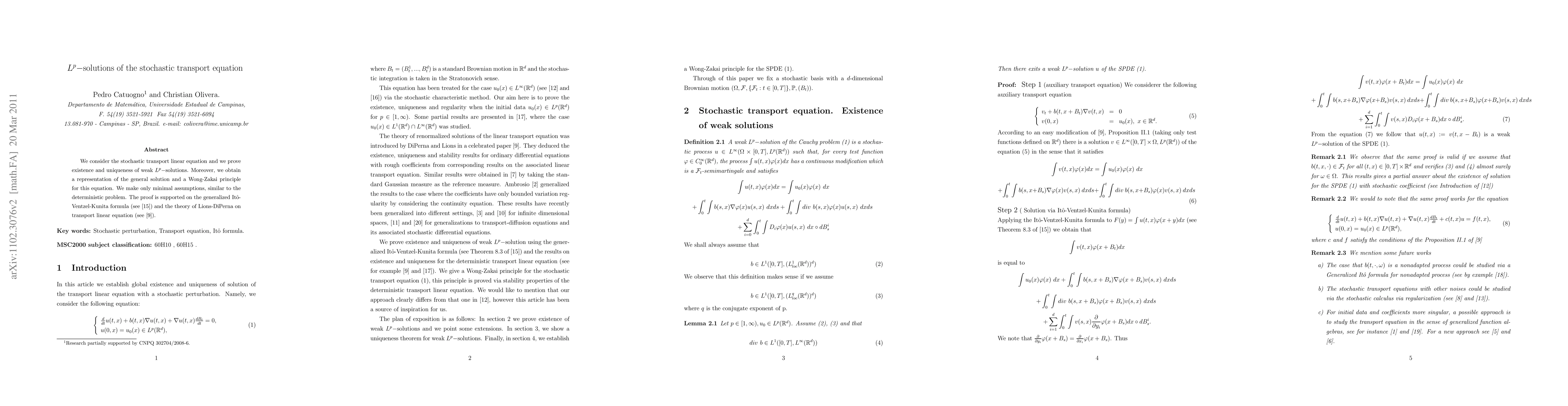 This paper proves the existence and uniqueness of weak $L^{p}$-solutions for the stochastic transport equation, providing a general solution representation and a Wong-Zakai principle. The proof leverages the generalized Itô-Ventzel-Kunita formula and the Lions-DiPerna theory.