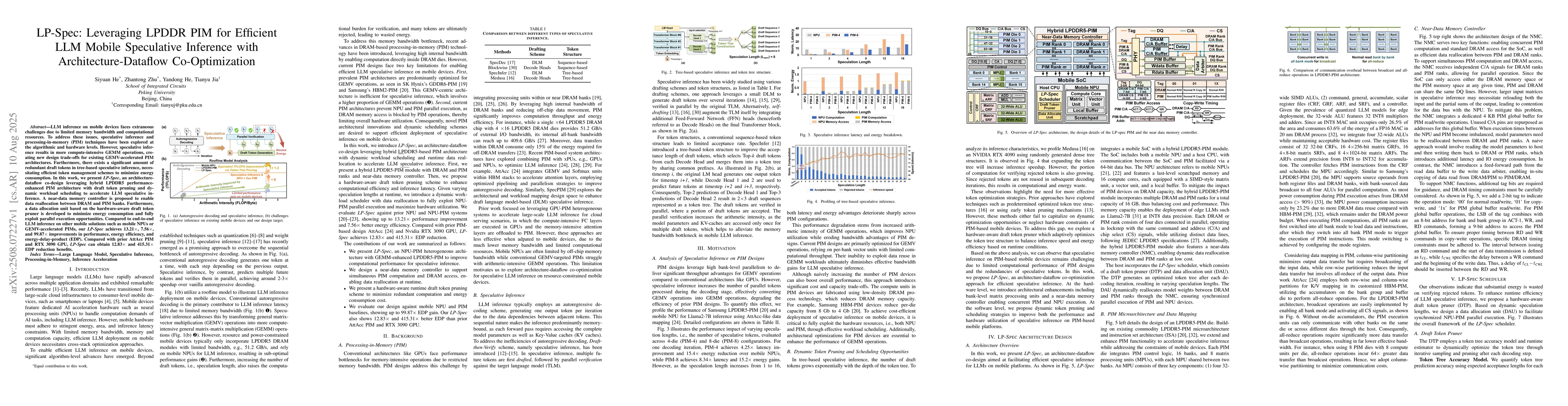 LP-Spec introduces an architecture-dataflow co-optimization approach for efficient speculative inference, incorporating a near-data memory controller, draft token pruning, and dynamic workload scheduling.