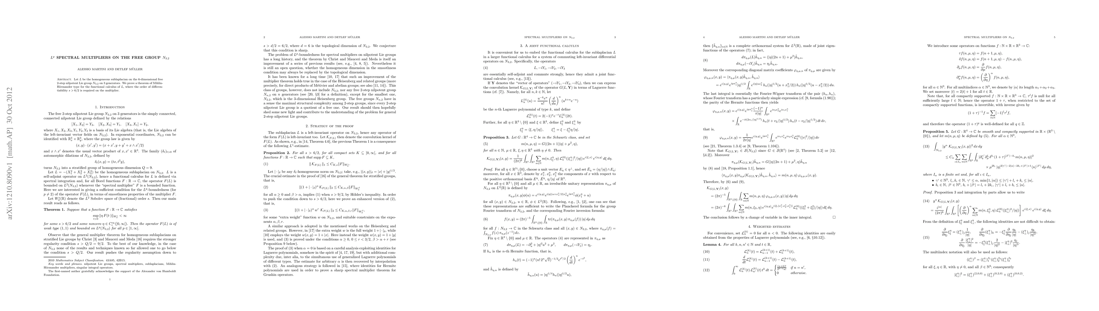 Let $L$ be the homogeneous sublaplacian on the 6-dimensional free 2-step nilpotent group $N_{3,2}$ on 3 generators. We prove a theorem of Mihlin-H\"ormander type for the functional calculus of $L$, where the order of differentiability $s > 6/2$ is required on the multiplier.