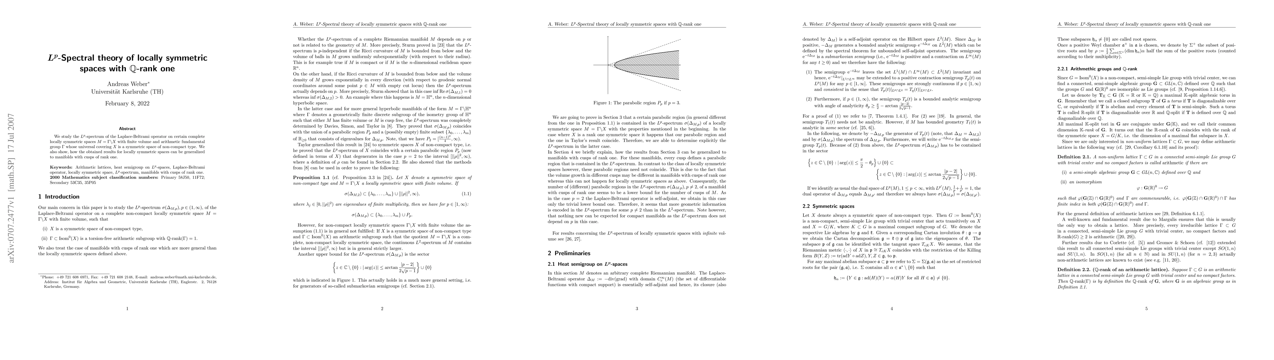 This paper investigates the $L^p$-spectrum of the Laplace-Beltrami operator on complete locally symmetric spaces with $Q$-rank one and extends the findings to manifolds with cusps of rank one.