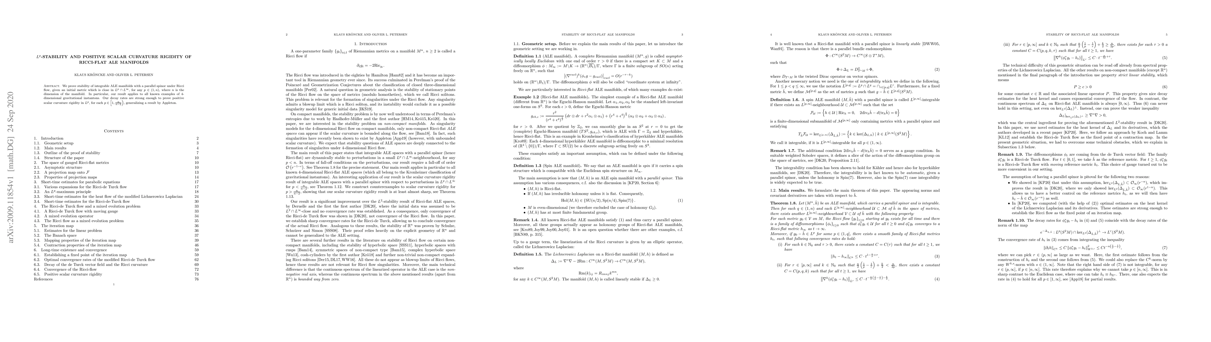 We prove stability of integrable ALE manifolds with a parallel spinor under Ricci flow, given an initial metric which is close in $L^p \cap L^\infty$, for any $p \in (1, n)$, where $n$ is the dimension of the manifold. In particular, our result applies to all known examples of $4$-dimensional gravitational instantons. Our decay rates are strong enough to prove positive scalar curvature rigidity in $L^p$, for each $p \in \left[1, \frac{n}{n-2}\right)$, generalizing a result by Appleton.