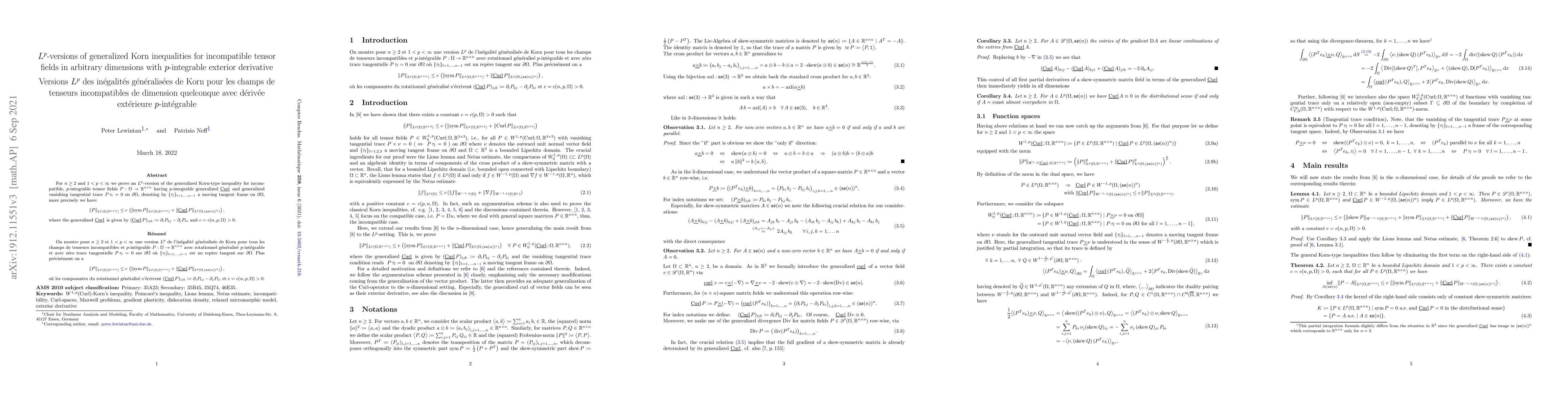 This paper proves an $L^p$-version of the generalized Korn inequality for incompatible tensor fields with $p$-integrable exterior derivative, showing that the $L^p$ norm of the tensor field is bounded by a constant times the sum of its symmetric part and its generalized curl in $L^p$ norm.