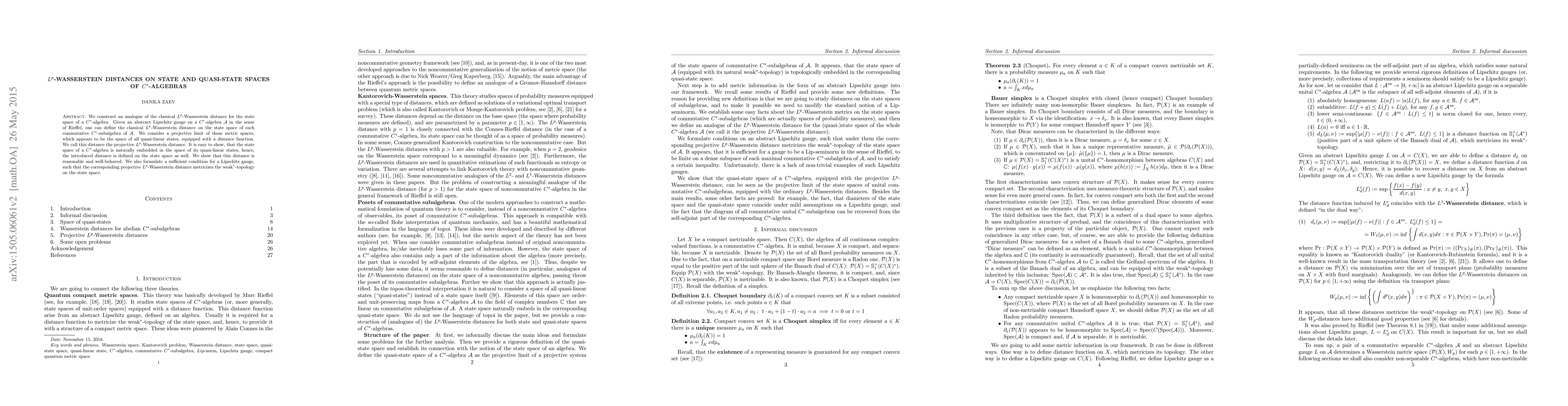 We construct an analogue of the classical $L^p$-Wasserstein distance for the state space of a $C^*$-algebra. Given an abstract Lipschitz gauge on a $C^*$-algebra $\mathcal{A}$ in the sense of Rieffel, one can define the classical $L^p$-Wasserstein distance on the state space of each commutative $C^*$-subalgebra of $\mathcal{A}$. We consider a projective limit of these metric spaces, which appears to be the space of all quasi-linear states, equipped with a distance function. We call this distance the projective $L^p$-Wasserstein distance. It is easy to show, that the state space of a $C^*$-algebra is naturally embedded in the space of its quasi-linear states, hence, the introduced distance is defined on the state space as well. We show that this distance is reasonable and well-behaved. We also formulate a sufficient condition for a Lipschitz gauge, such that the corresponding projective $L^p$-Wasserstein distance metricizes the weak$^*$-topology on the state space.