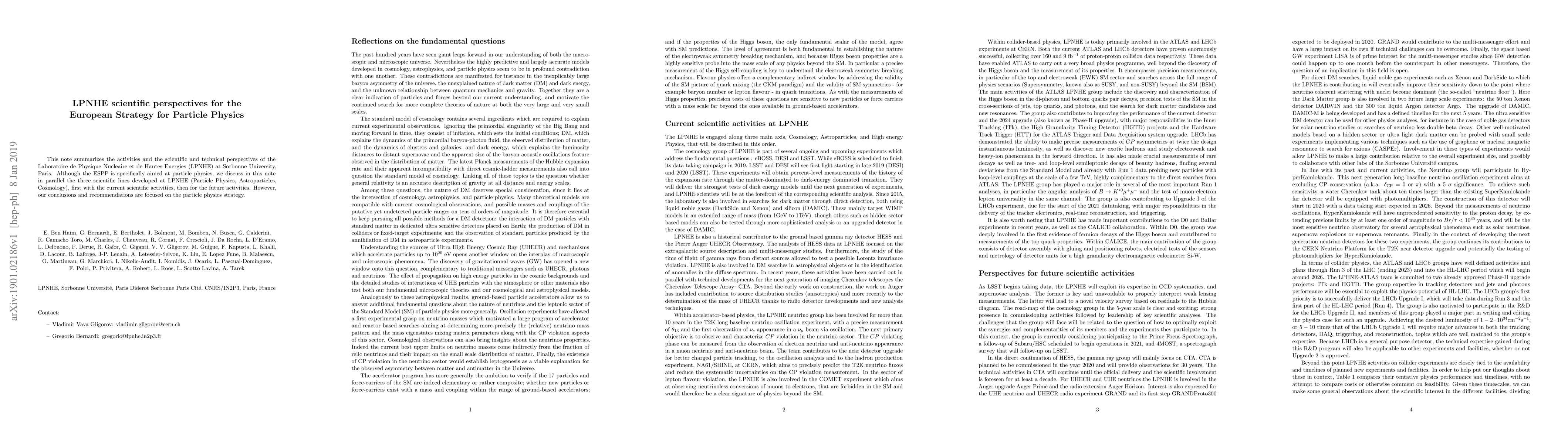 This note summarizes the activities and the scientific and technical perspectives of the Laboratoire de Physique Nucleaire et de Hautes Energies (LPNHE) at Sorbonne University, Paris. Although the ESPP is specifically aimed at particle physics, we discuss in this note in parallel the three scientific lines developed at LPNHE (Particle Physics, Astroparticles, Cosmology), first with the current scientific activities, then for the future activities. However, our conclusions and recommendations are focused on the particle physics strategy.